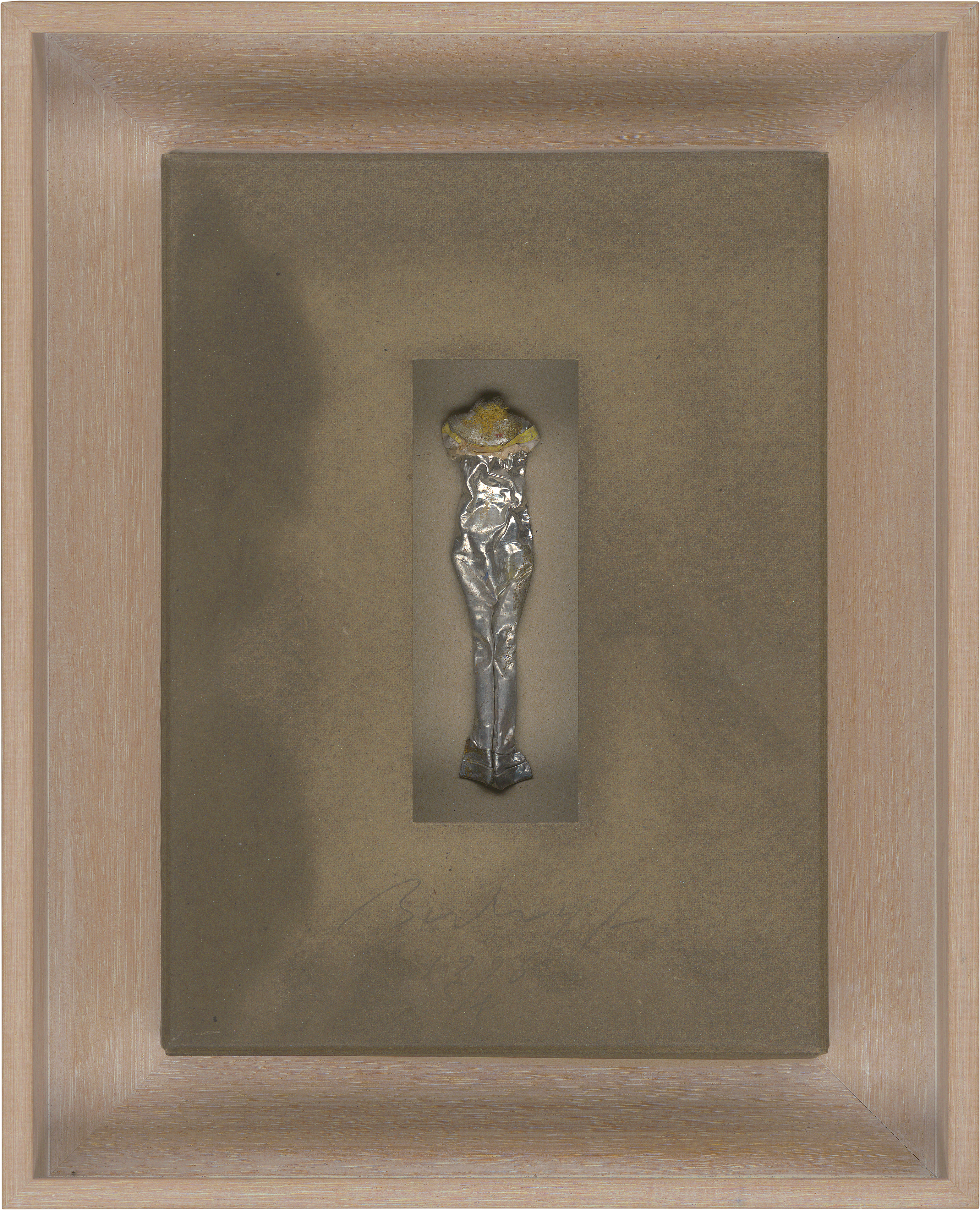Multiple. Metall-Tubenfigur in aufgeschnittenem, in Wachs getauchtem Karton, in Holz-Objektkasten montiert. 1996.