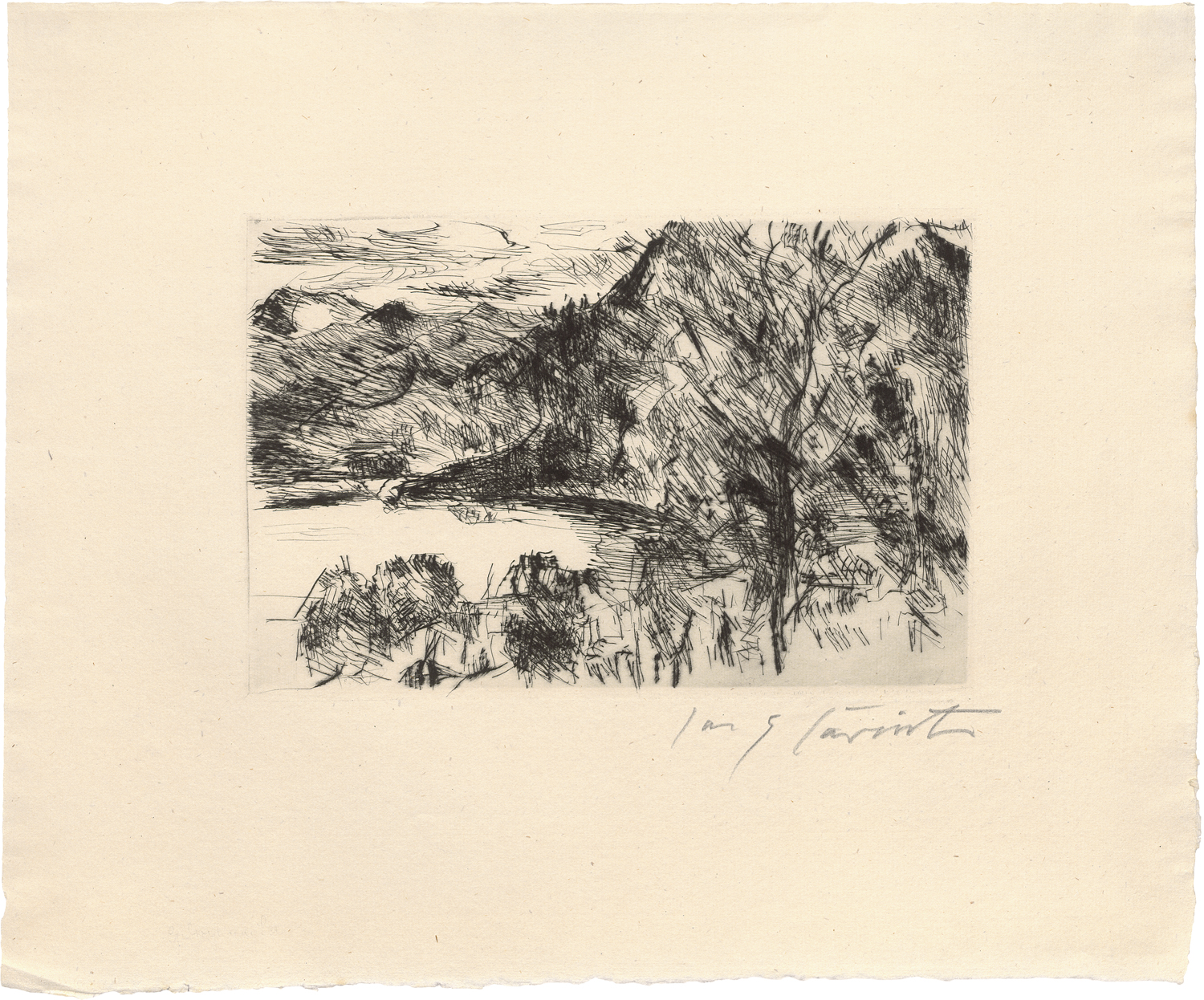 "Walchensee mit Jochberg" aus der Folge "Der Walchensee (klein)", erschienen im Akademie-Verlag, Berlin 1926; "Winter am Walchensee (Hotel Fischer am See)" erschienen in einer Auflage von 200 Exemplaren in der Vorzugsausgabe von "Der Zeichner Lovis Corinth" von Georg Biermann, Verlag Ernst Arnold, Dresden. Beides prachtvolle, tiefdunkle und gratige Drucke mit Rand, teilweise mit dem Schöpfrand.