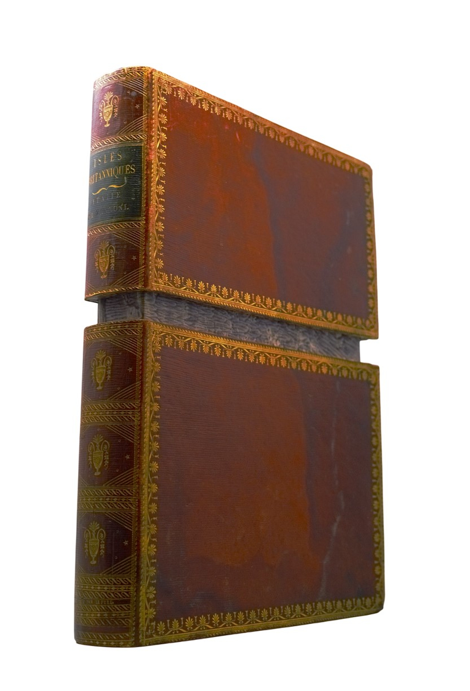 Bellin, Jacques Nicolas. Isles Britanniques. Vier Kupferkarten in je 8 Segmenten auf Leinen aufgezogen. 59 x 90,5 cm (Plattenrand). Roter OLeder-Schuber (etwas berieben, bestoßen sowie fleckig) in Form eines Buches mit goldgeprägtem RSchild, Rück- und Deckelvergoldung sowie dreiseitigem Goldschnitt. Paris 1757.