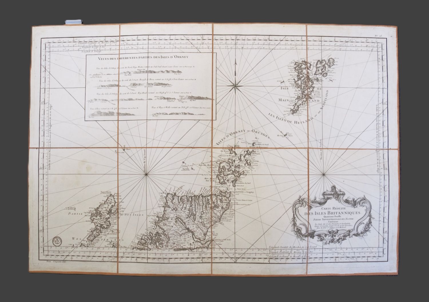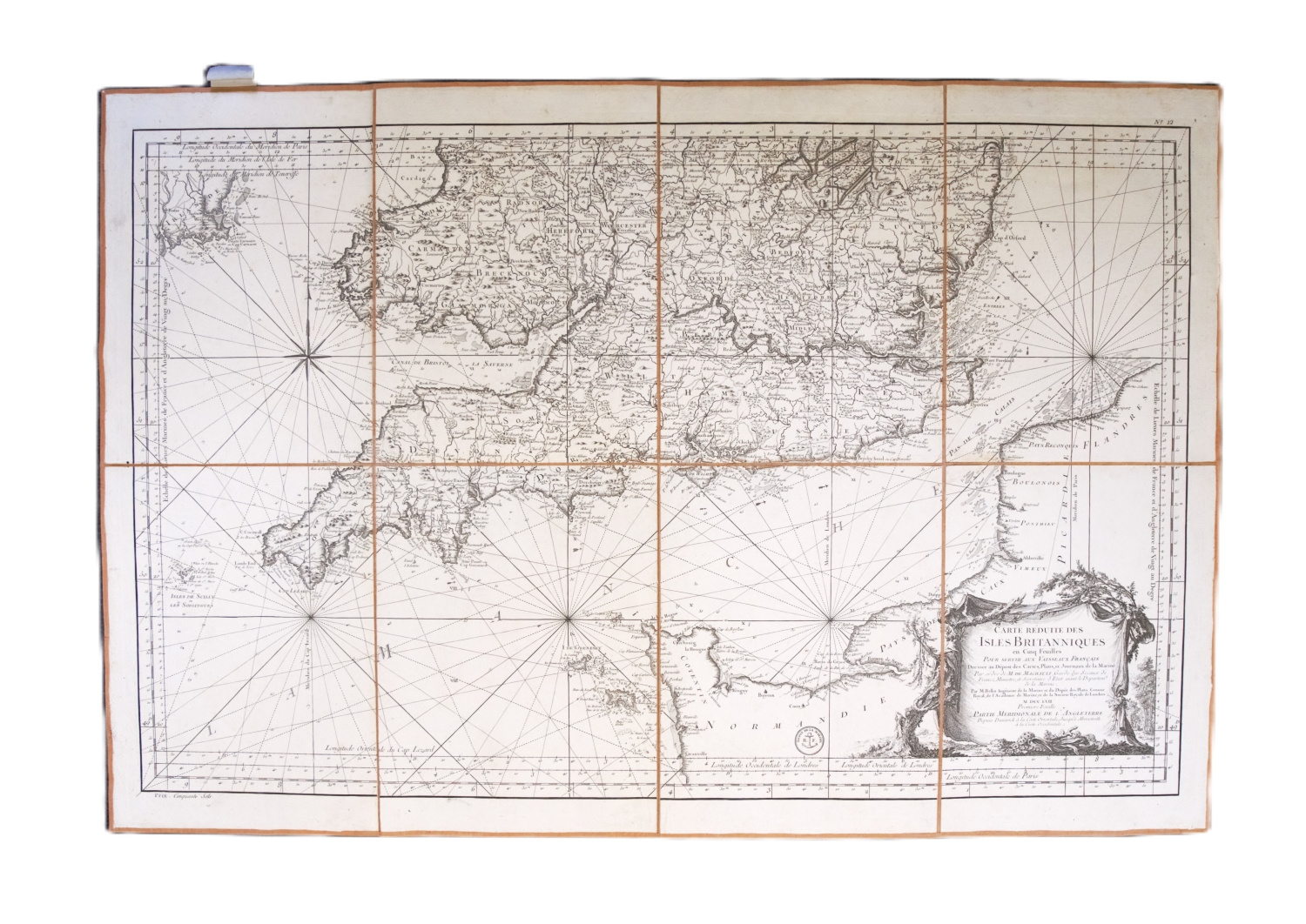 Die vier Seefahrer Karten stammen von dem Kartographen Jacques Nicolas Bellin (1703-1772), der unter anderem an an der "Encyclopédie" von Denis Diderot (1713-1784) und Jean Baptiste le Rond d’Alembert (1717-1783) mitwirkte. Vorhanden sind: I. Carte réduite des Isles Britannique en cinq feuilles. - II. Carte réduite des Isles Britannique en seconde feuilles. - III. Carte réduite des Isles Britannique en troisième feuilles. - IV. Carte réduite des Isles Britannique en quatrième feuilles. – Dabei: Derselbe. Carte réduite des Isles Britanniques cinquième feuille contenant l'Irlande. Kupferstichkarte. 90 x 57,5 cm (Plattenrand). Um 1801. - Mit kleinen Fehlstellen an den Falzen.