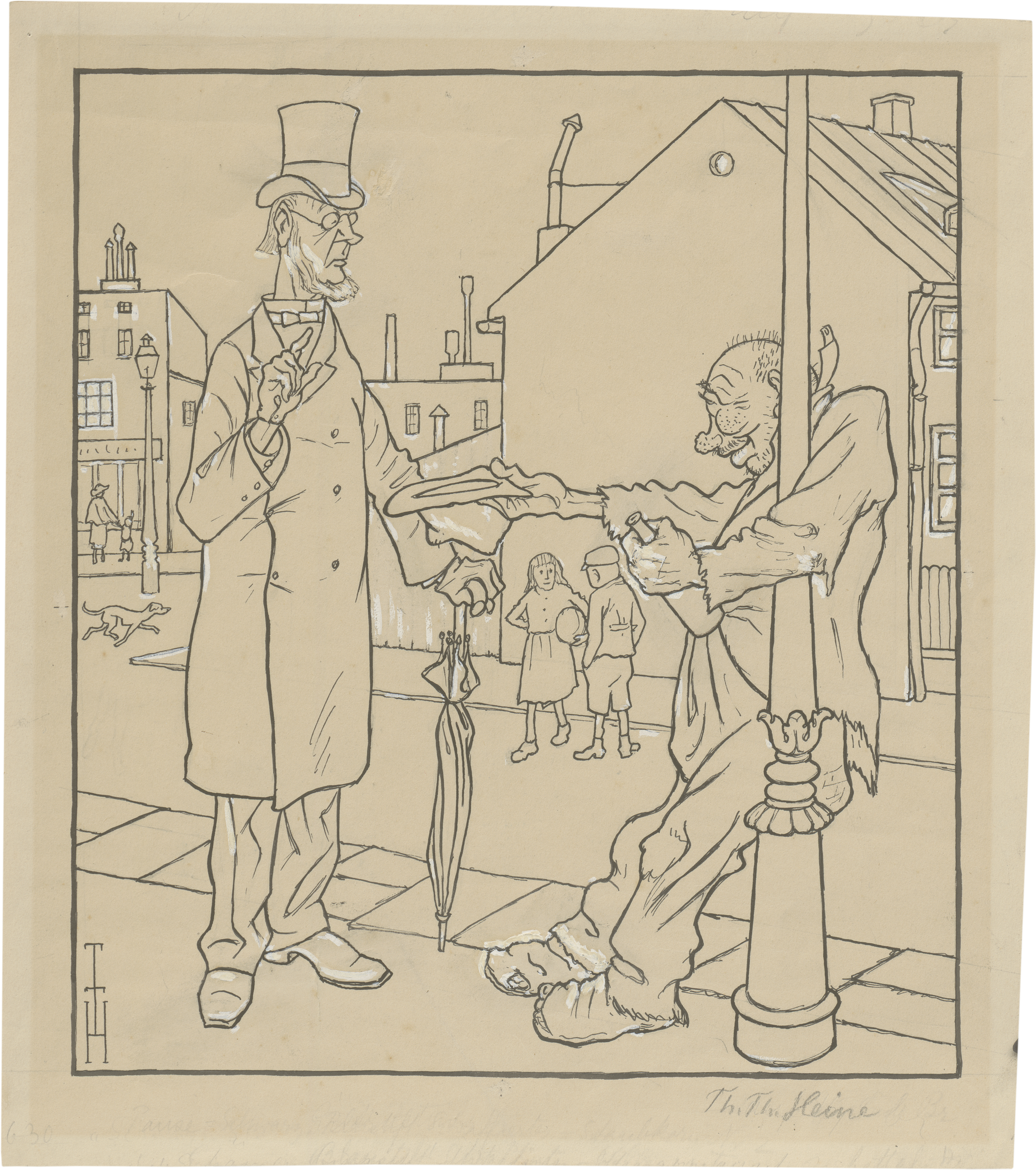 Unten links mit Bleistift signiert "Th. Th. Heine" und innerhalb der Zeichnung links mit Feder in Schwarz mit dem Künstlersignet "TTH", verso (wohl von fremder Hand) betitelt und bezeichnet.