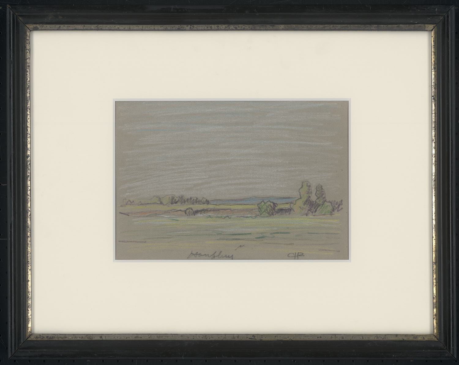 Die mit nur wenigen, sparsamen Strichen im charakteristischen, monochromen Rotbraun ausgeführte Zeichnung gehört zur Reihe der "Köpfe", die Holmead selber nie als Portraits bezeichnete. Beigegeben: Eine monogrammierte Landschaftszeichnung von Holmead, farbige Kreiden.