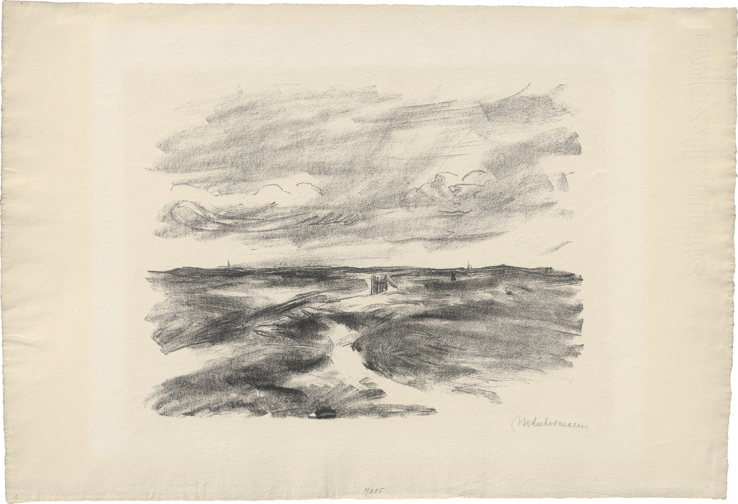 Die Sommermonate der Jahre 1905 bis 1913 verbrachte Liebermann in dem idyllischen Seebad an der holländischen Nordsee zwischen Den Haag und Amsterdam. Im Jahr 1909 entstand dort eine ganze Reihe ähnlicher Lithographien der Dünenlandschaft, aber auch Reiter oder spielende Kinder am Strand gehörten zu seinen bevorzugten Motiven. Prachtvoller, fein differenzierter Druck mit dem vollen Rand.