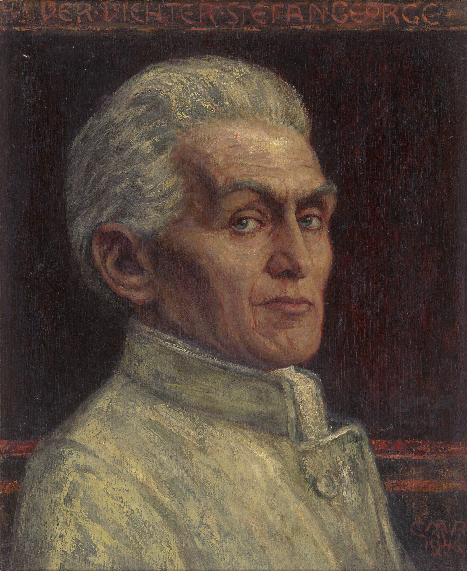 Der Dichter im Halbprofil nach rechts, den strengen Blick gerade zum Betrachter gewandt. Rebel malte, nachdem er als junger Künstler, wohl um 1896, Stefan George in Berlin begegnet war, tief beeindruckt zahlreiche Portraits des Dichters, meist wahrscheinlich nach Fotografien der Bingener Fotografen Hilsdorf. Ein Großteil seines Werkes scheint bei einem Bombenangriff 1943 vernichtet worden zu sein.