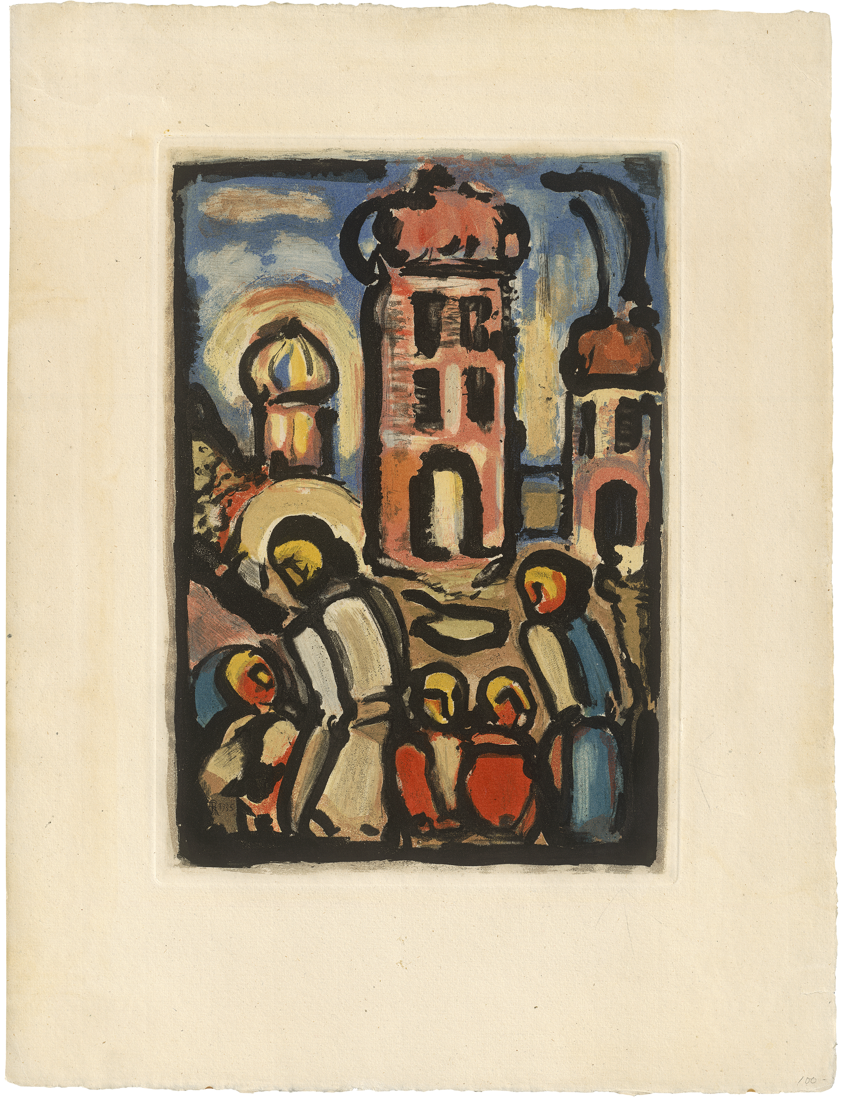 Aus der Auflage erschienen für die Suite "Passion" von André Suarès, einer Folge von 17 farbigen Aquatintaradierungen, herausgegeben von Ambroise Vollard, Paris 1939, unten links in der Platte monogrammiert und datiert. Prachtvoller, farbintensiver Druck wohl mit dem vollen Rand.
