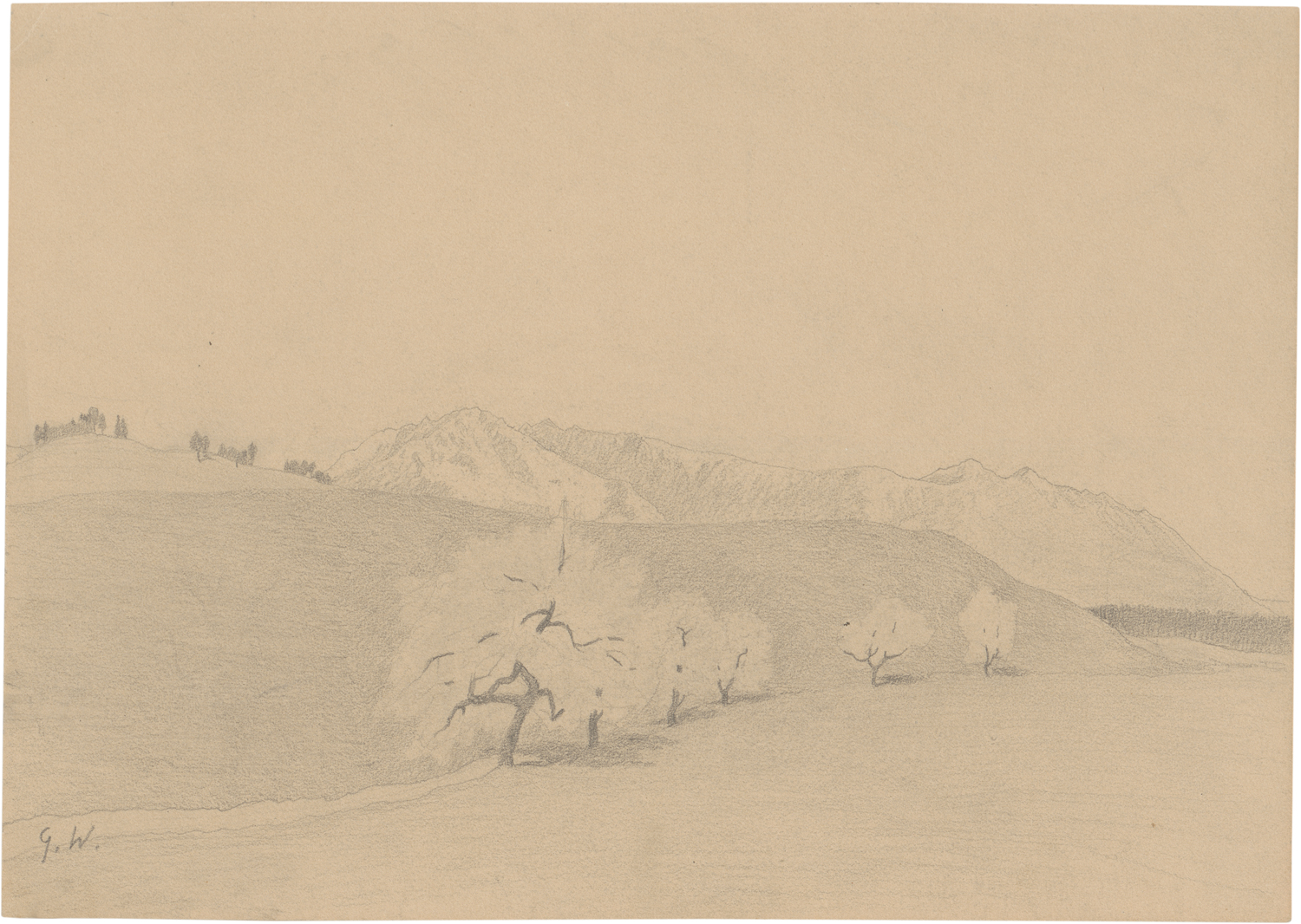 Mit zarten, fein abgestuften Schraffuren modelliert Wunderwald die sanft geschwungene, hügelige Landschaft, dazwischen setzt er kontrastierend tiefdunkle Baumstämme. Die Zeichnung mit dem mächtigen Bergmassiv im Hintergrund entstand möglicherweise in seiner Tiroler Zeit, um 1910. Charakteristisch, auch für sein künftiges Schaffen, ist die Überschaubarkeit der Szenerie und die Konzentration des Künstlers auf des Wesentliche. Verso eine weitere Landschaftsskizze des Künstlers.