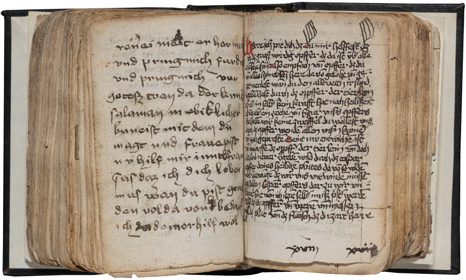 Johannes von Neumarkt et al. Mystische Sammelhandschrift. Reichhaltige deutsche Sammelhandschrift auf Papier mit wenigen lateinischen Texten, aus mindestens drei gleichzeitigen Faszikeln zusammengesetzt. 150 nn. Bl. 18-22 Zeilen. Schrift: Bastarda und Cursiva von verschiedenen Händen. Schriftraum: ca. 8-9 x 6 cm. Format: 11,2 x 7,2 cm. Mit durchgehender Rubrizierung, Initialen, Überschriften, Hervorhebungen, Unterstreichungen in Rot. Alte Lagensignatur VIII (Bl. 14r) bis XX (Bl. 145r). Moderner schlichter Leinenband um 1950 (etwas streng gebunden). Wohl Nürnberg, St. Katharina, 2. Drittel des 15. Jahrhunderts.