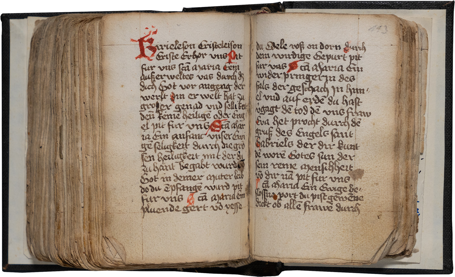 Unter den zahlreichen Aufsätzen und Artikeln, die über diese bedeutsame Sammelhandschrift und ihre einzelnen Partitionen erschienen, nennen wir hier u. a. Gerhard Eis, Geistliche Lyrik des späten Mittelalters aus unbekannten Handschriften, in: Euphorion 53 (1959), S. 441-455, hier S. 441f. - Gerhard Eis, Zur Überlieferung von 'Unser vrouwen klage', in: Germanisch-Romanische Monatsschrift N.F. 17 [48] (1967), S. 98-100. - Rainer Rudolf, Konrad, in: 2VL 5 (1985), Sp. 110. - Rolf Bergmann, Katalog der deutschsprachigen geistlichen Spiele und Marienklagen des Mittelalters (Veröffentlichungen der Kommission für Deutsche Literatur des Mittelalters der Bayerischen Akademie der Wissenschaften), München 1986, S. 489. - Edgar Büttner, Die Überlieferung von "Unser vrouwen klage" und des "Spiegel" (Erlanger Studien 74), Erlangen 1987, S. 18. – Teils etwas gebräunt, kaum fleckig, erste und letzte Blätter mit kleinen Randläsuren, jedoch keinerlei wesentlicher Textverlust, insgesamt sehr gut erhalten und klar lesbar.