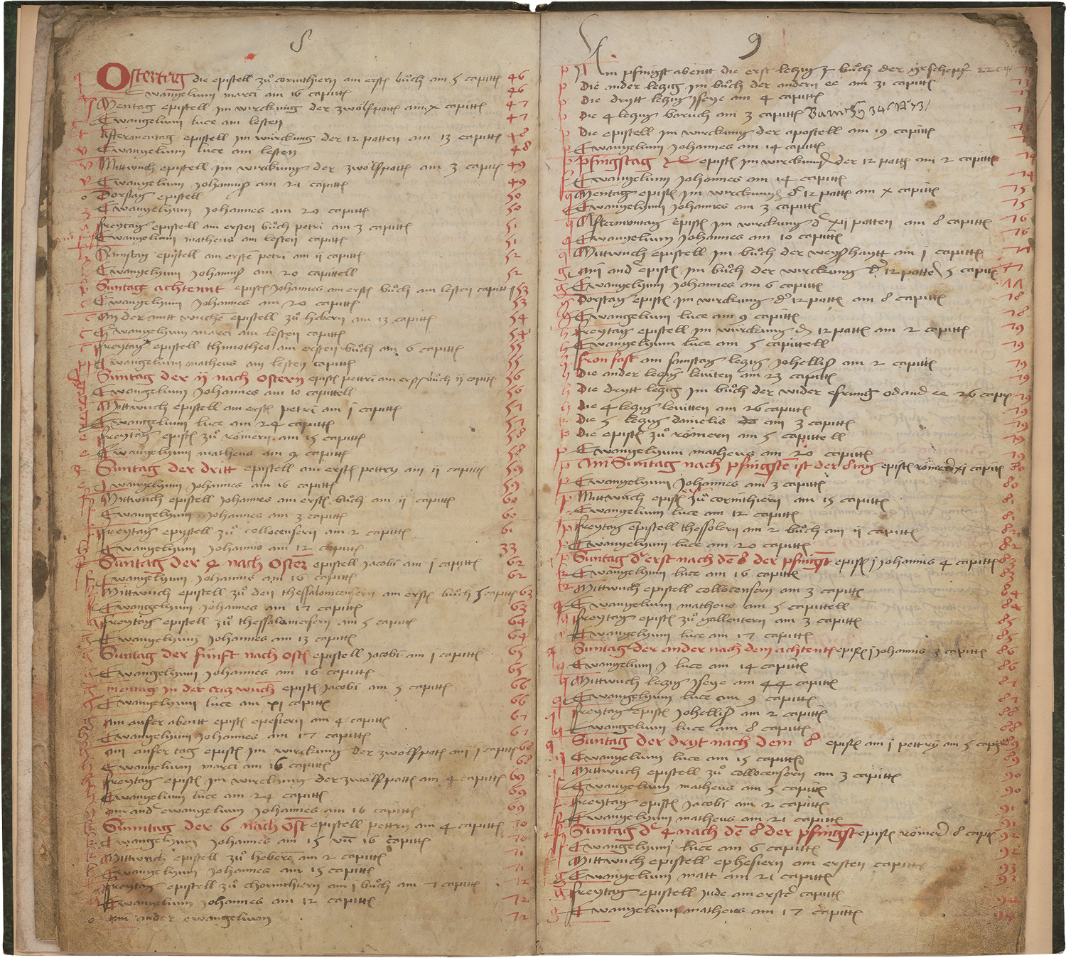 S. 3-13. Ausführliches Register der Epistel- und Evangelienlesungen für das ganze Kirchenjahr. Jeder Eintrag verzeichnet das relevante Bibelbuch und die Kapitelnummer (häufig mit einem Textanfang der Lesung), jeweils mit einem Verweis (in roter Tinte) auf die Seiten- oder Blattzahl eines Buches, das diese Lesungen enthält. Dieses Buch ist keine Bibel, da die Seiten- oder Blattzahlen zwar in Blöcken, aber dennoch regelmäßig ansteigen. Vielmehr handelt es sich um ein liturgisches Perikopenbuch, das die Bibellesungen vollständig enthält. Mit Hilfe dieses Registers konnte ein Priester sich auf die Lesungen während der Messe vorbereiten oder eine Predigt konzipieren. Vermutlich hat der Schreiber das Werk für den eigenen Gebrauch angefertigt.