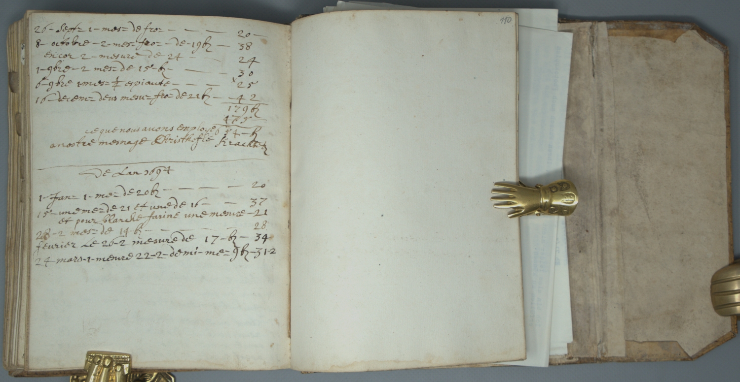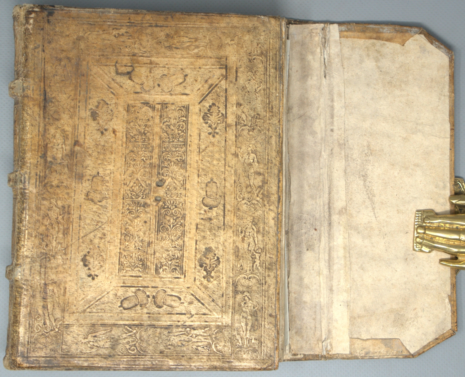Auf leergebliebenen Blättern (1r-1v, 23v, 43r-46r, 73v. 106v-109v, 113v-114v) wurden im Zeitraum 1650-1694 persönliche und geschäftliche Aufzeichnungen von Mitgliedern der in der Ostschweiz (u.a. Lausanne) ansässigen Familien Krachbeltz, Criblet und Sechaux eingetragen. – Nur ganz vereinzelt etwas fleckig, wenige Randverstärkungen, Vorsätze stärker angestaubt und gedunkelt, wenige Seiten leicht angeschmutzt zum Schluss. Die unbeschriebenen Blätter meist blütenweiß. Der bemerkenswert schöne Klappenband mit reicher Blindprägung im Schweinsleder ist teils leicht abgegriffen und etwas angeschmutzt, zeigt neben Floralvignetten Blindstempel mit Eicheln und jeweils eine elegante Rolle mit den sieben Kardinaltugenden.