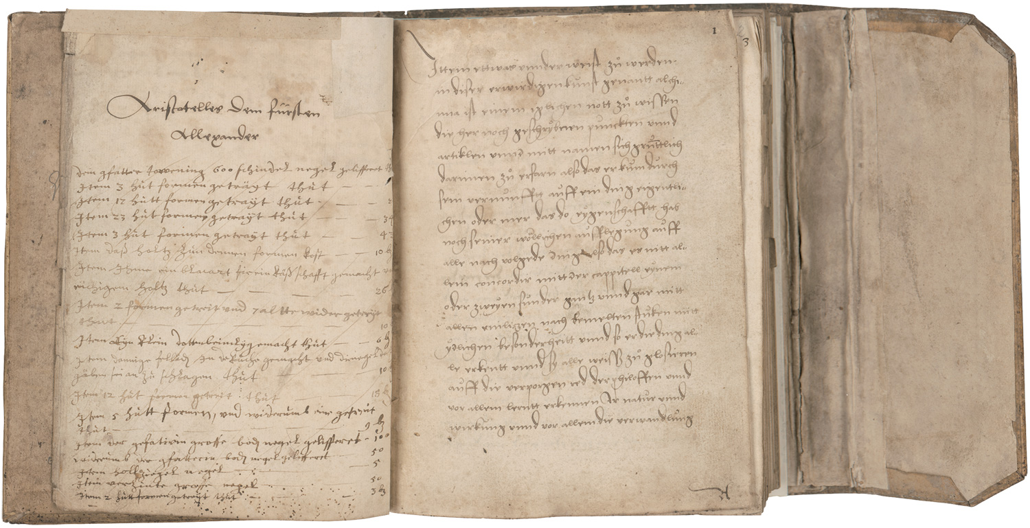 "Aristotelles dem Fürsten Allexander" und "Ross gartt der weysen" - Ein umfangreiches Kompendium alchemistischer Werke, die zusammen das alchemistisches Grundwissen ihrer Zeit vermitteln. Enthalten sind folgende Schriften. Besonders hübsch ist auch die kleine Federzeichnung "Hic est furnus sancti thomae de aquino" (S. 84v, alte Zählung "16).
