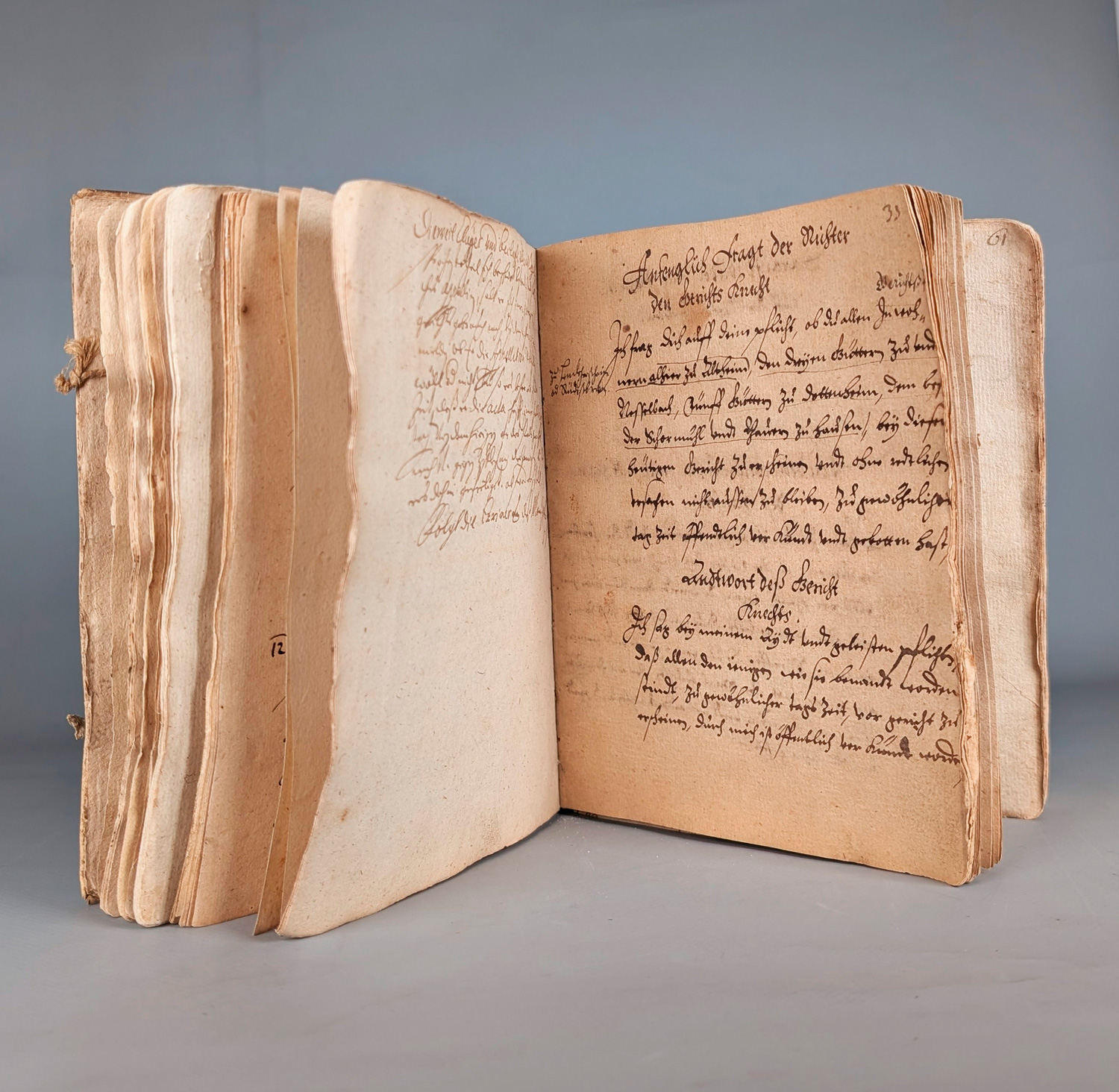 Ein eindrucksvolles und seltenes Zeugnis frühneuzeitlicher Rechtspraxis, das Judeneid (mit hebräischer Umschrift), Hexenrecht und gerichtliche Verhörtechnik in einer regional verortbaren Handschrift vereint. Besonders der Judeneid verleiht dem Manuskript eine ausgeprägte judaica-historische Dimension, während die Abschnitte zu Malefiz und Hexe tiefe Einblicke in die Rechts-, Sozial- und Mentalitätsgeschichte des 17. Jahrhunderts ermöglichen. Ein Objekt von hoher Attraktivität für spezialisierte Sammler, Institutionen und die Forschung. – Etwas ausgebunden, einige Blätter lose, mehrere sind weiß geblieben.