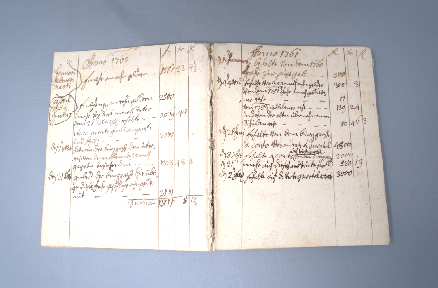 Aus dem heutige tschechischen Schloss Nový zámek (Neuschloß) stammendes Kontorbuch mit Hunderten von Einträgen der Jahre 1750-1761, die eine ganze Wirtschaftsgeschichte im Barock rekonstruieren lassen: "Ausgabe von NeuSchloß Monath January 1750". Zum Barockschloss gehört der Neugarten sowie die größten Parkanlagen Böhmens, die im Stil der englischen Gärten angelegt worden waren - und noch heute zu den bedeutendsten Tschechiens gehören.