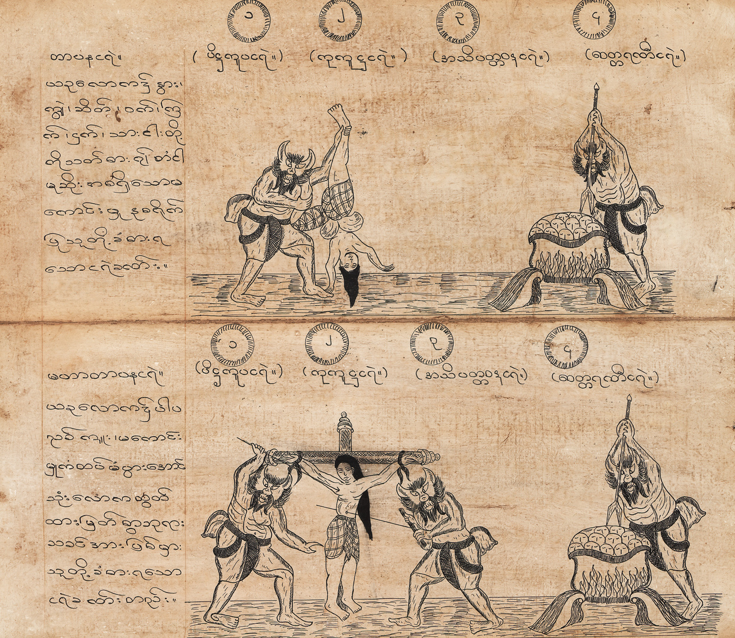 1) Schwarzes Parabaik, wohl ein astronomisches Parabaik. 20 Kompartimente 12 x 37 cm. Ausgefaltet 240 x 37 cm. Birmanische Abugida in Schwarz, Rot und Violett. Mit figurativen und geometrischen Tabellen, Zeichnungen in Feder, mit Rot und grauem Bleistift gehöht, Kämpfer und Tierkreiszeichen darstellend. Schwarz-dunkelbraune Khoi-Deckel.