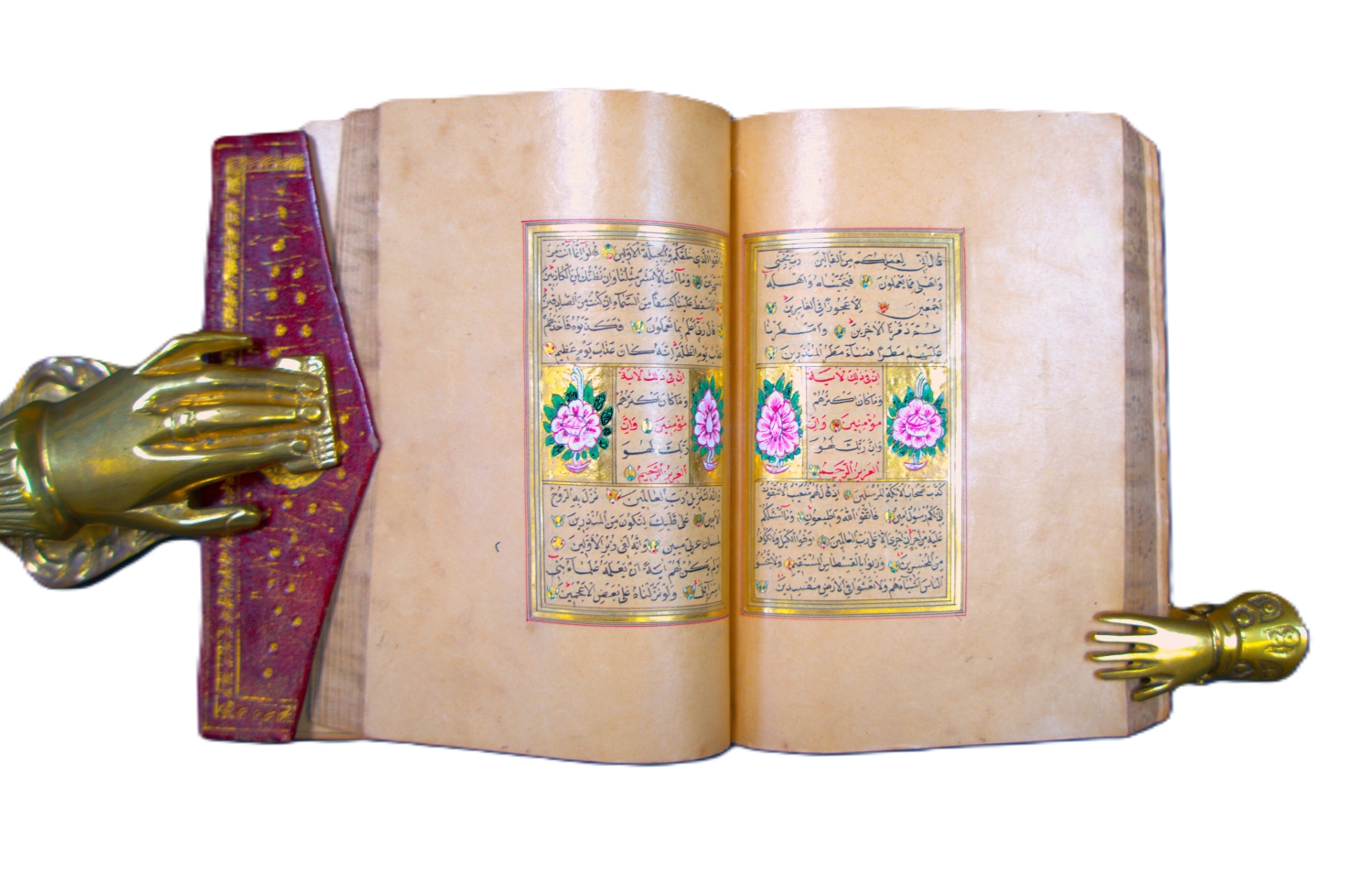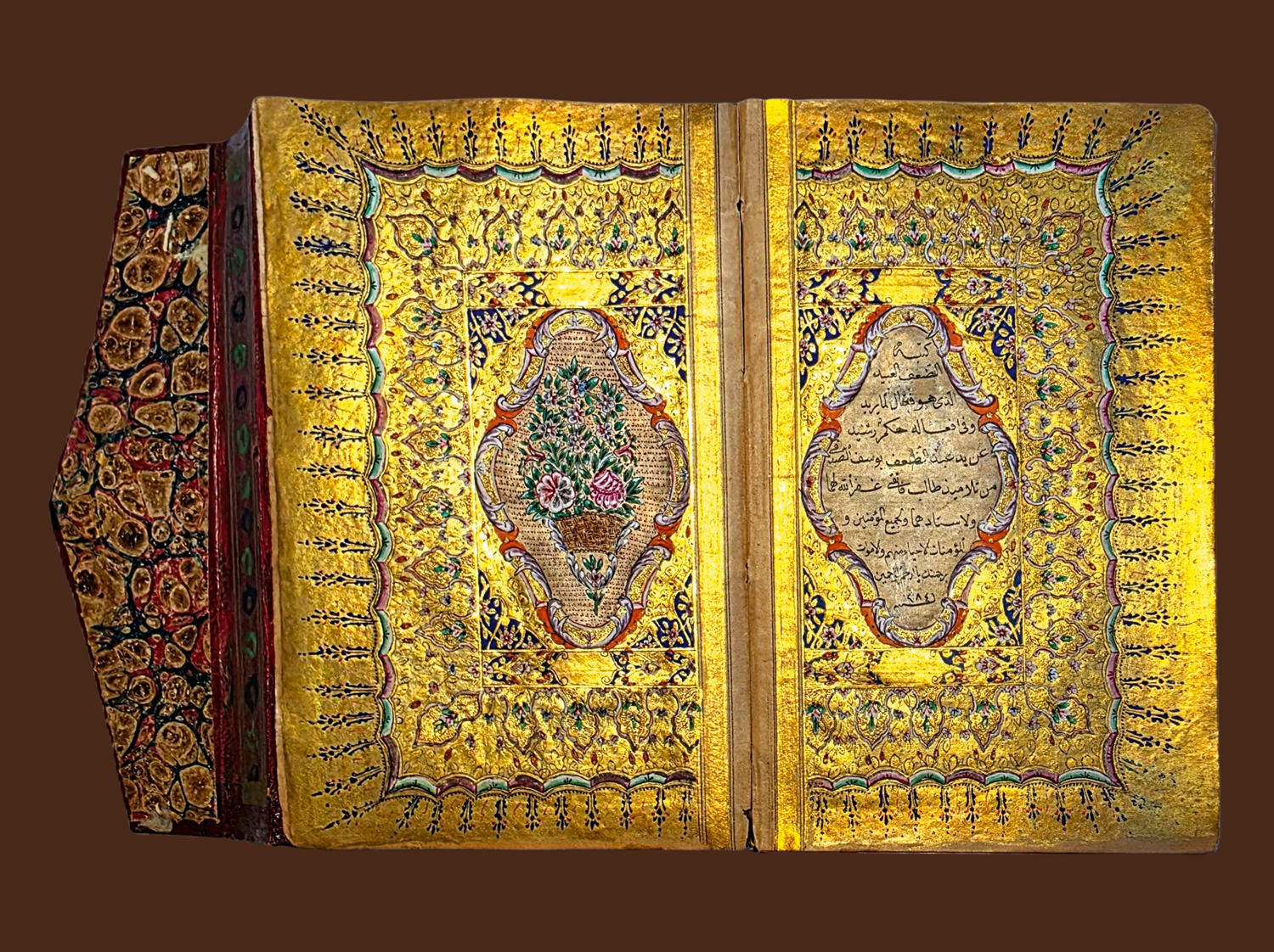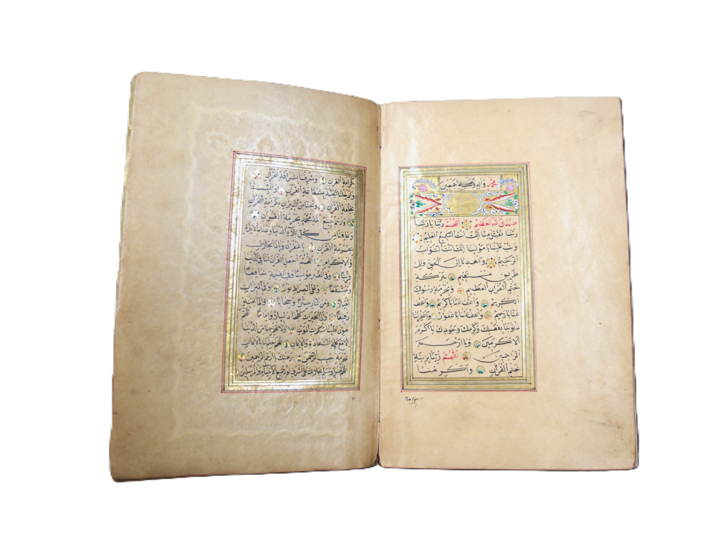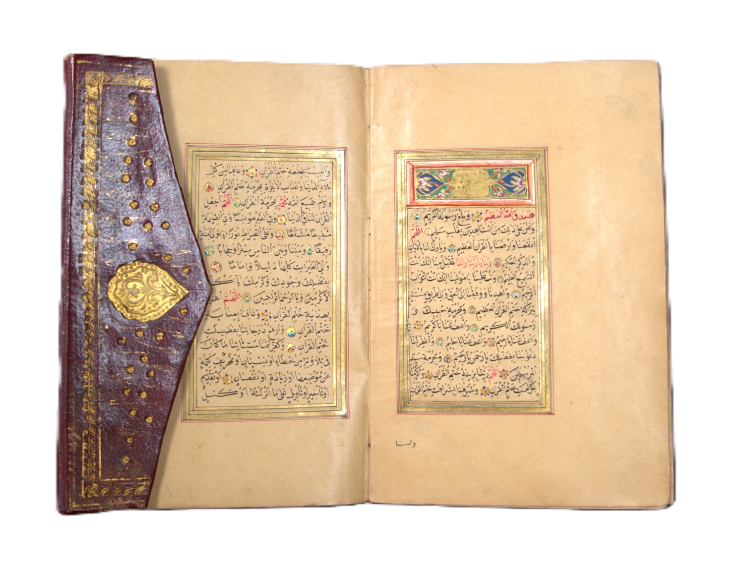 Überaus reich geschmückter Goldkoran in seinem originalen, ebenfalls reich verzierten Klappenband mit drei goldüberzogenen, Doppelzierseiten mit Ornamenten in teils punziertem Gold und Farben, in Indigoblau, in Karmesinrot, in Grün, in Orange und Violett, teils mit Weißhöhungen und -verläufen, datiert auf das Jahr "1284" Anno Hegirae, nach der Hidschra. Die Handschrift beginn mit einer besonders feinen, auf flächigem Goldgrund mit reicher Farbigkeit und Ornamentik geschmückten Doppelzierseite (Serlevha), auf der in feinster schwarzer Miniaturschrift im Nastaliq-Duktus die erste Sure (al-Fatiha) und der Anfang der zweiten Sure (al-Baqara) in je einer Kartusche stehen, die mit zahlreichen bunten Blumen umgeben sind. Um den mit viel blau und roten Palmetten verzierten Kasten ist eine breite Bordüre mit zehn Schildern gelegt, die wiederum mit entzückenden bunten Blumen bemalt sind. Blaue und rote Zinnen strahlen radial von der Bordüre aus.