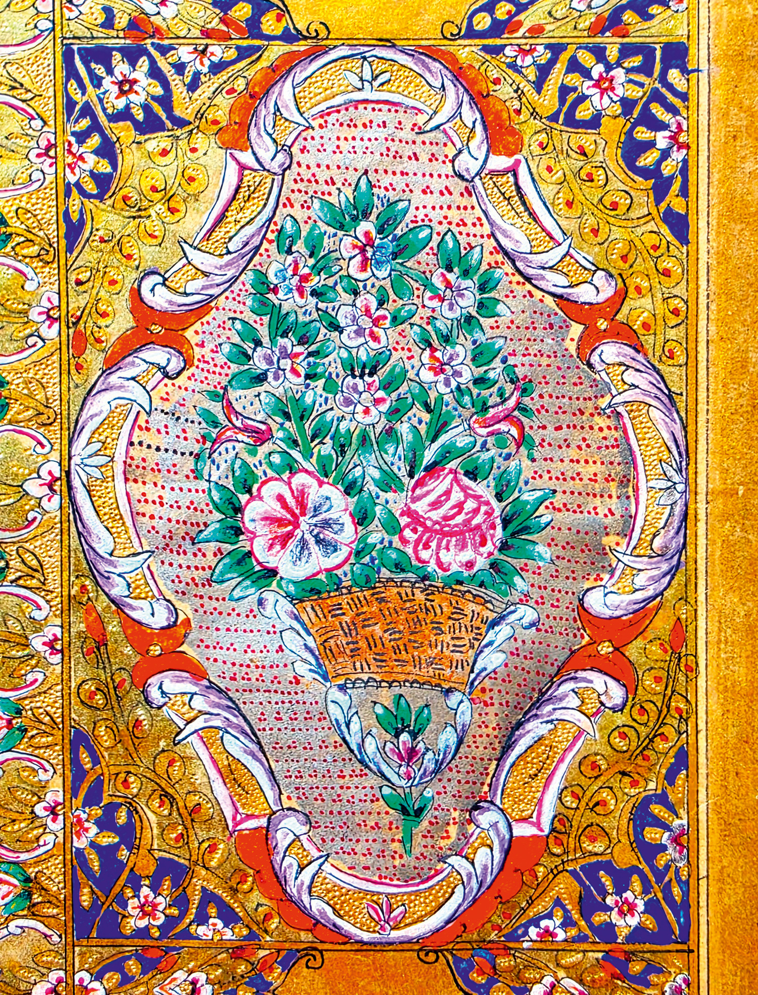 Unverkennbar erscheinen hier Stilelemente, die seit dem frühen 19. Jahrhundert aus der westlichen Ornamentik in die orientalische Buchillumination (Tezhip) übernommen wurden: Barockkartuschen, Schildformen, Ovalformen, Blumenspiegel, aber auch Tabulae oder auf der Schlusszierseite ein veritables Blumenbouquet in einem Bastkorb. Einen ganz besonderen Effekt erzeugen die zahlreichen Punktpunzierungen in den Palmetten oder den Rahmen der Losange- oder Ovalkartuschen. Auch diese wurden aus dem barocken Formenvokabular Westeuropas übernommen, sie geben der Flächenvergoldung eine gewisse dreidimensionale Tiefe und glitzern im Licht.