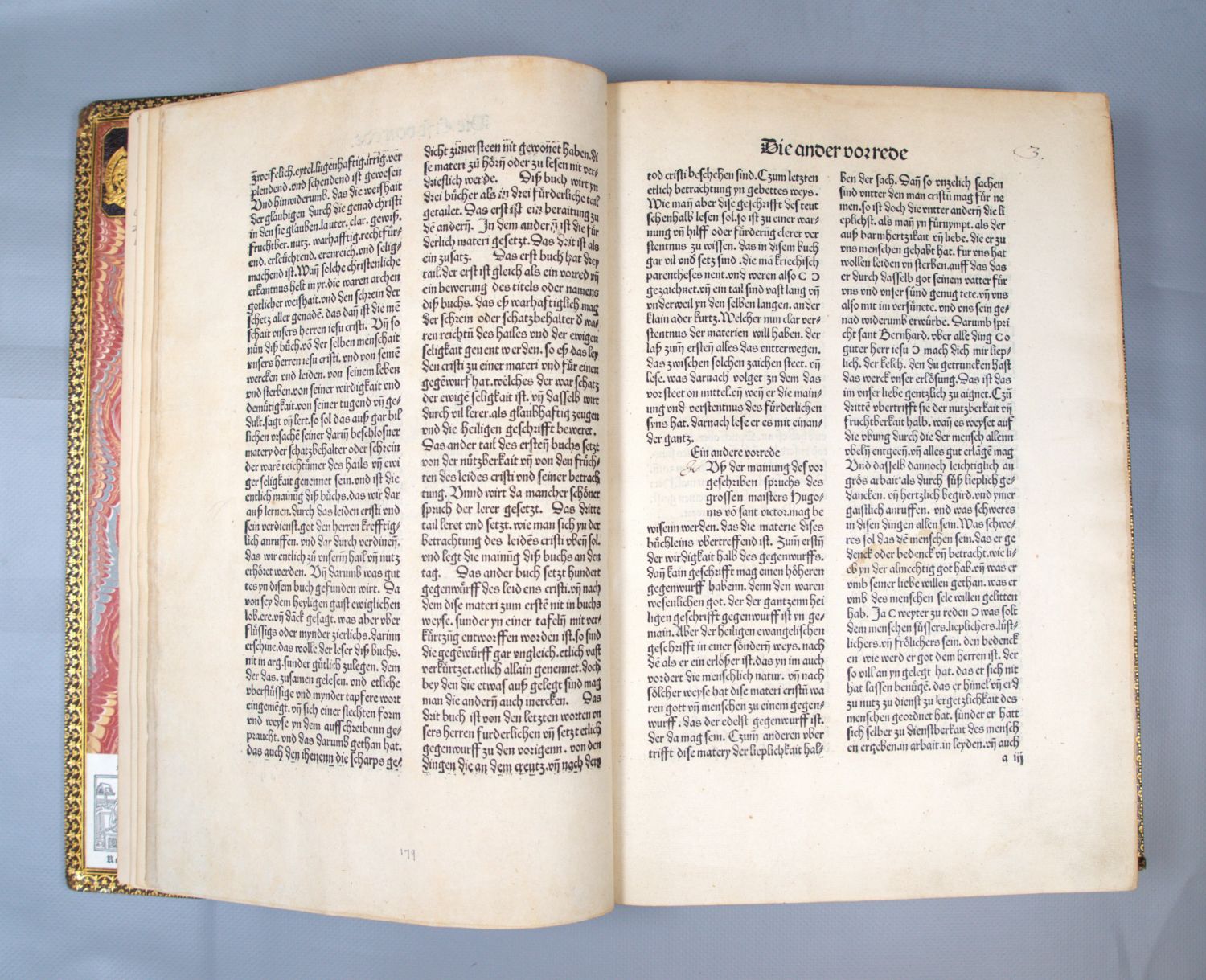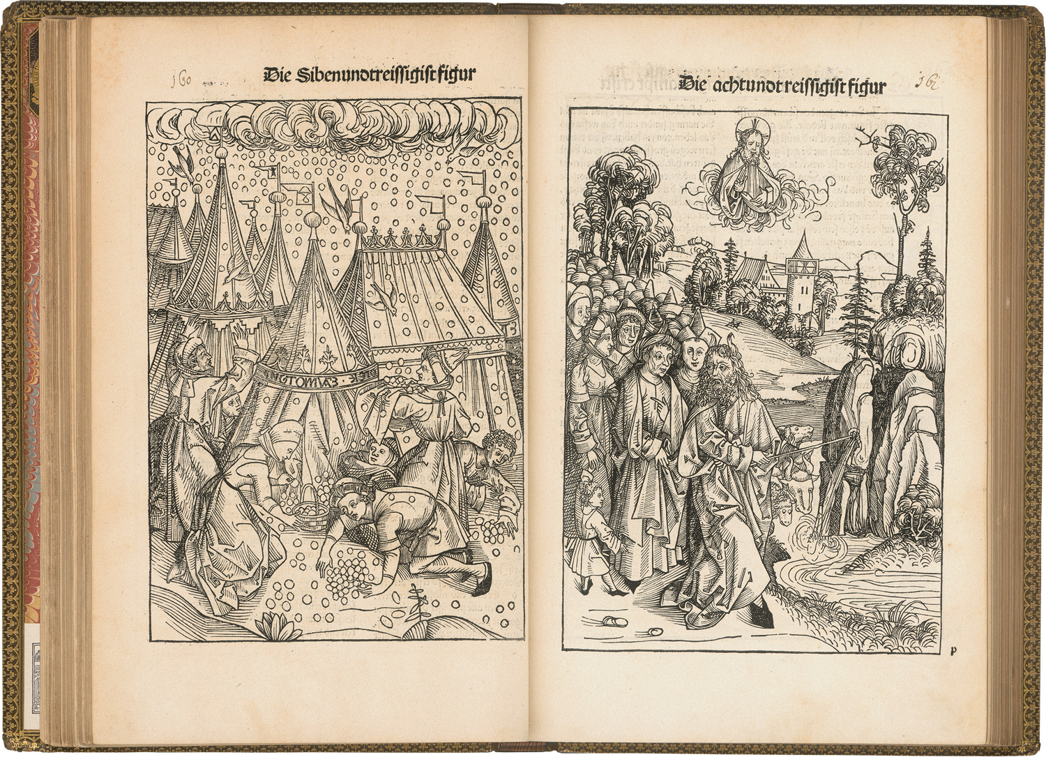 Fridolin, Stephan. Schatzbehalter oder Schrein der wahren Reichtümer des Heils und ewiger Seligkeit. 353 (statt 354) nn. Bl. (ohne das letzte weiße). 2 Spalten. 40-43 Zeilen. Got. Typ. Schriftraum: 33,3 x 23,3 cm. Format: 31,5 x 21,8 cm. Mit 96 (5 wdhl.) ganzseitigen Textholzschnitten von Michael Wolgemut und Wilhelm Pleydenwurff. Dunkelbraues Maroquin um 1880 (nur leichte Bestoßungen und Bereibungen, wenige Kratzer und Druckstellen, Gelenke etwas brüchig) über 5 Zierbünden mit goldgeprägtem RTitel und reicher RVergoldung, doppelten Deckelgoldfileten mit Dentelles und Eckfleurons, Stehkantenpunktierung und reicher Innenkantenvergoldung sowie Vorsätzen aus türkischem Marmorpapier, dreiseitiger Goldschnitt, in modernem Schuber aus dunkelbraunem Kalbsleder. Nürnberg, Anton Koberger, 18. XI. 1491.