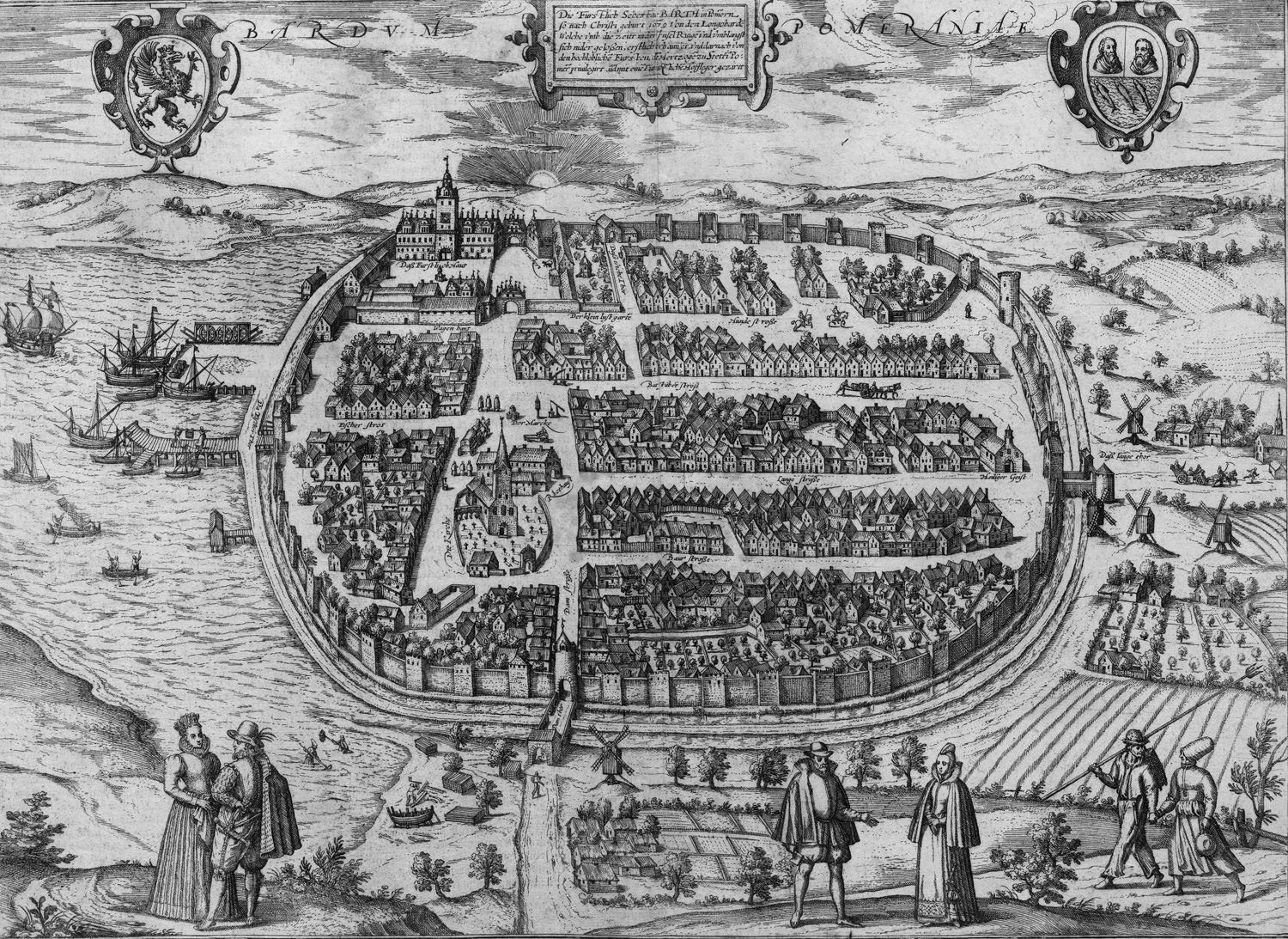 Braun, Georg und Franz Hogenberg. Bardum Pomeraniae. Die Furstlich sehestat Barth in Pommern. Kupferstich. 32,5 x 45 cm. Mit Passepartout. Um 1590.