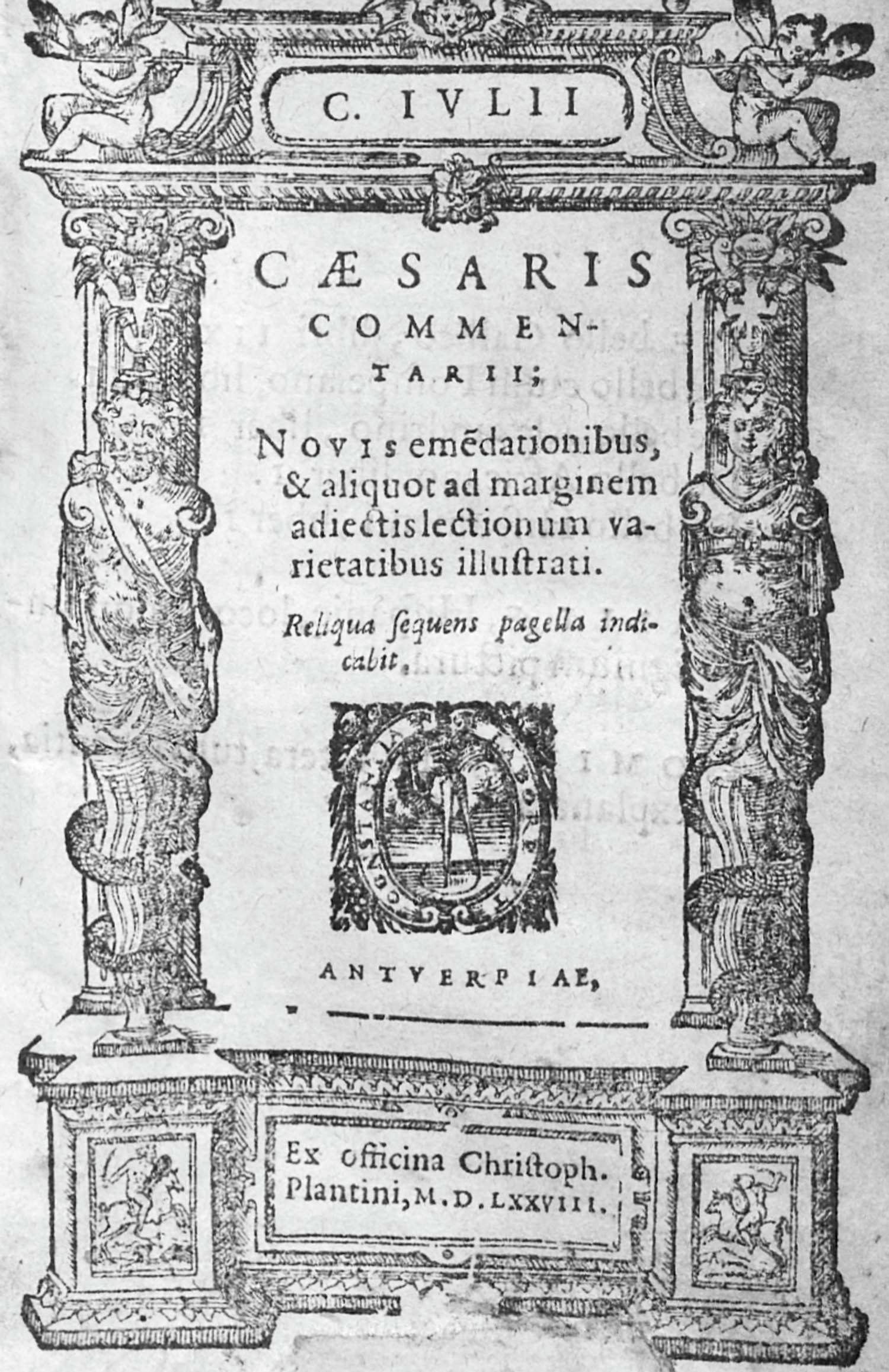 Caesar, Gaius Iulius. Commentarii. Novis emendationibus, et aliquot ad marginem adiectis lectionum varietatibus illustrati. 8 Bl., 556 S., 2 Bl. Mit Titel-Holzschnittbordüre und 5 blattgroßen Textholzschnitten. 12 x 8 cm. Blindgeprägter Schweinslederband d. Z. (fleckig und stärker berieben, vorderes Gelenk angeplatzt). Antwerpen, Christoph Plantin, 1578.