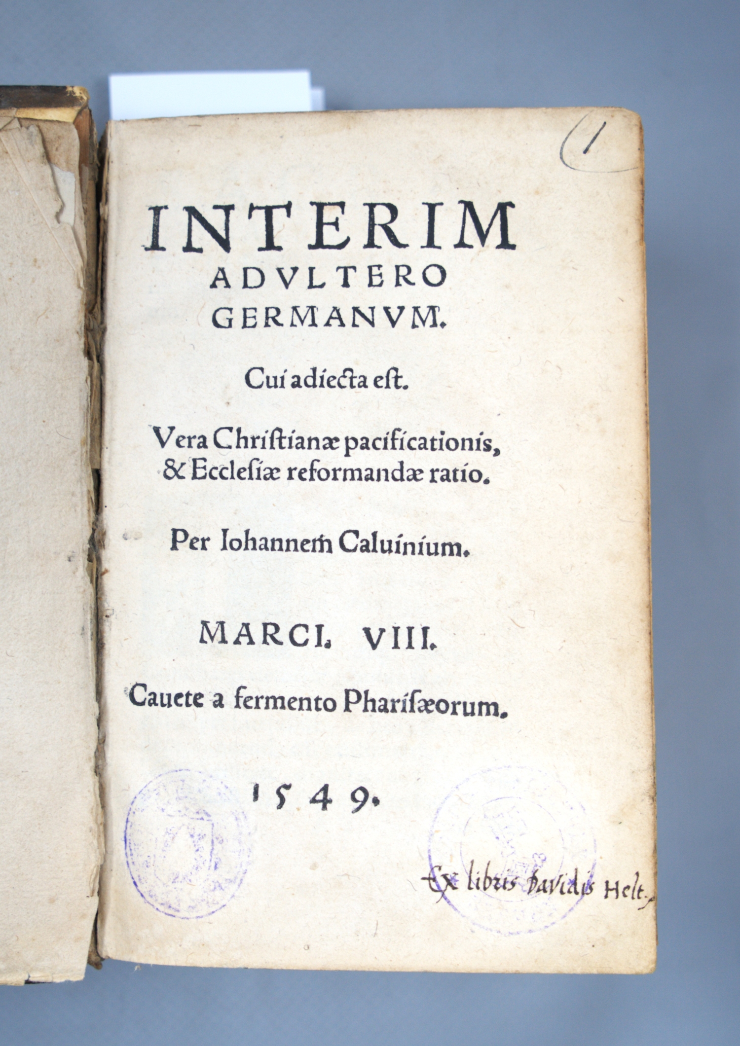 I. Joannes Calvin. Interim adultero germanum. Cui adiecta est. Vera christianae pacificationis, & ecclesiae reformandae ratio. (Magdeburg, Lotter), 1549. - VD 16, C323. Erichson, Bibl. Calviniana S. 9. Knaake III, 511 und Kuczynski 370. - Erste in Deutschland gedruckte Ausgabe, aus dem Jahr der Erstausgabe (Genf 1549). Wegen dieser Stellungnahme gegen das Augsburger Interim zog sich Calvin die äußerste Gegnerschaft der Lutheraner zu.