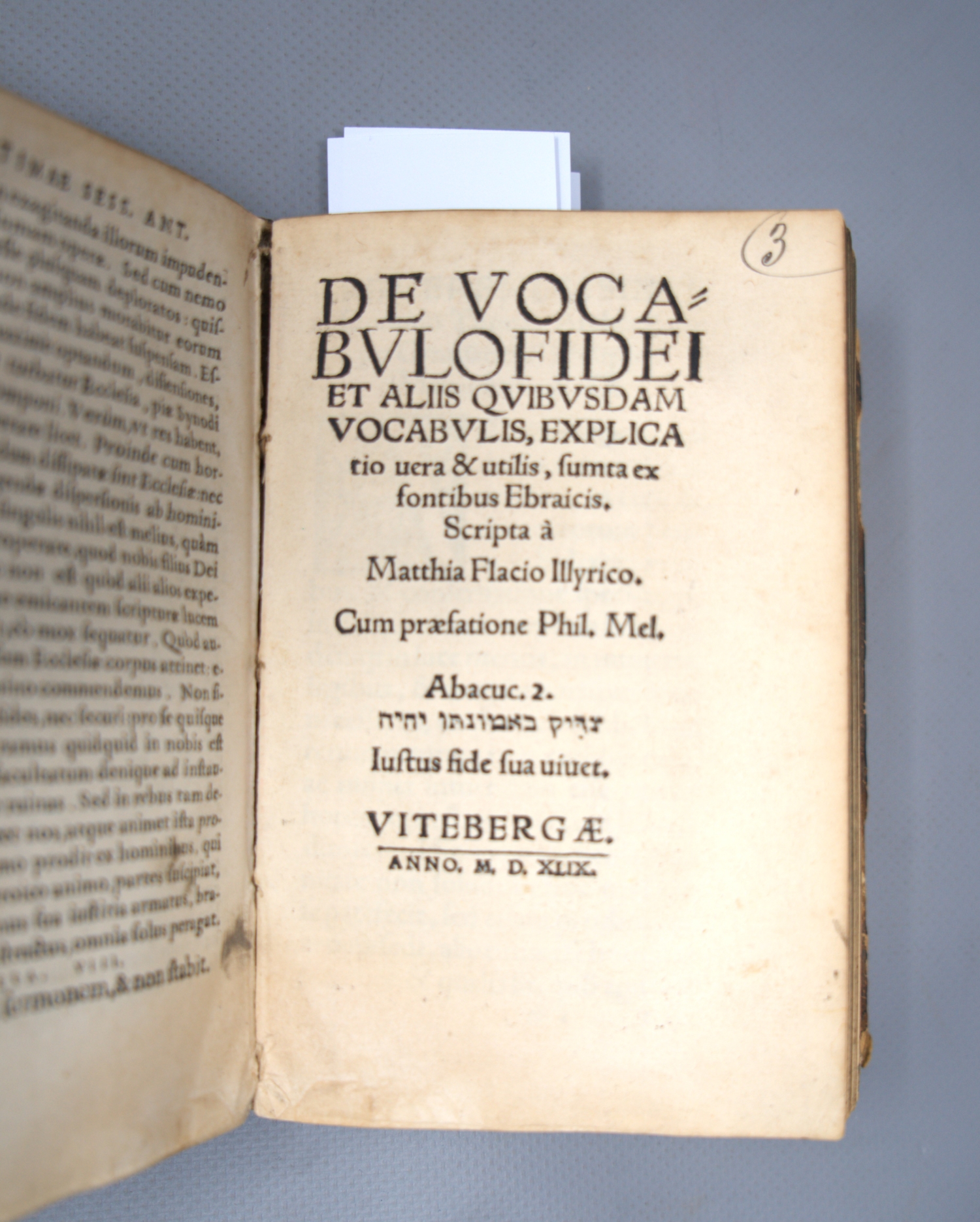 III. Flacius Matthias. De vocabulo fidei et aliis quibusdam vocabulis, explicatio vera & utilis, sumta ex fontibus Ebraicis 188 S., 1 Bl. Vitebergae, Creucer, 1549. - VD16 F 1525.