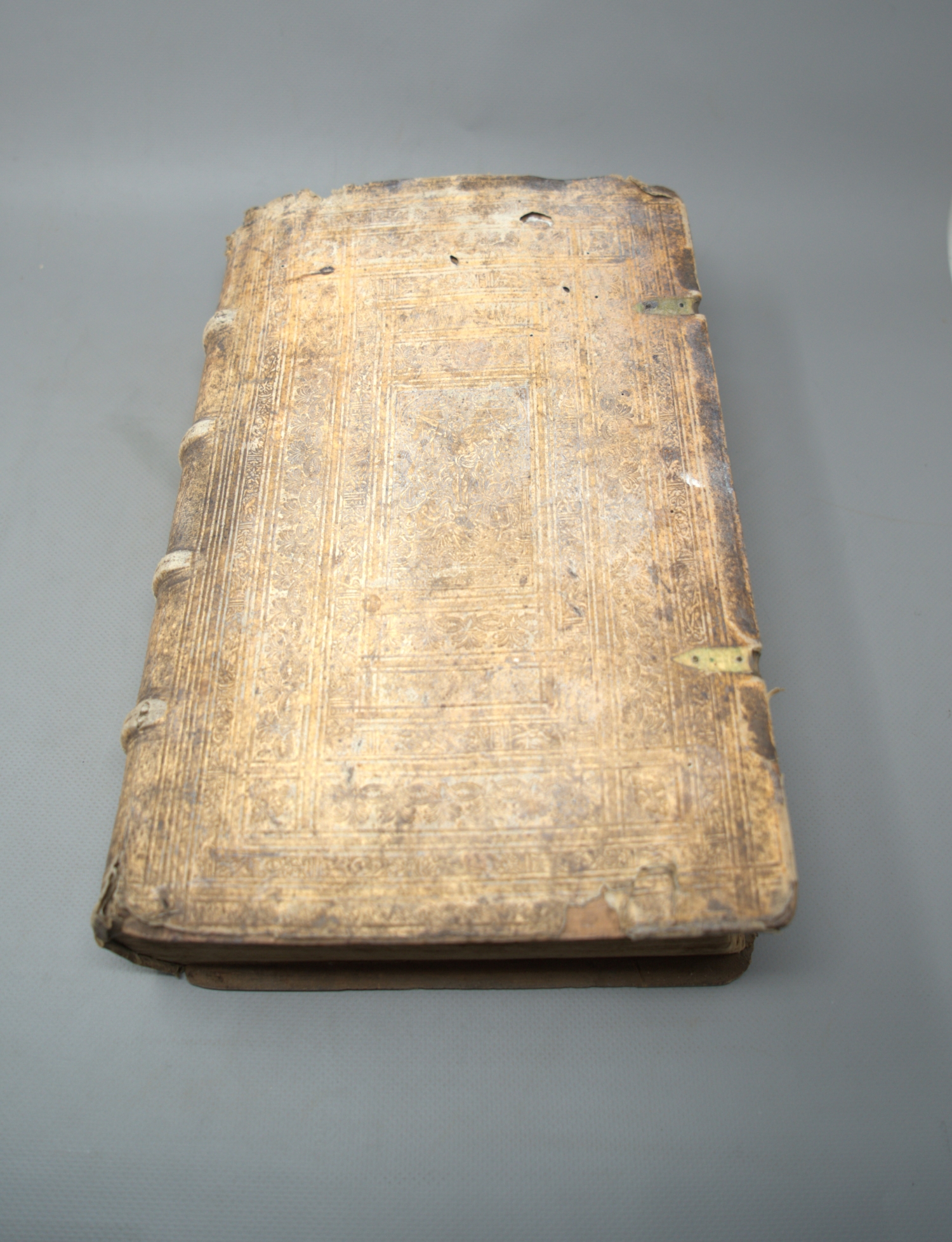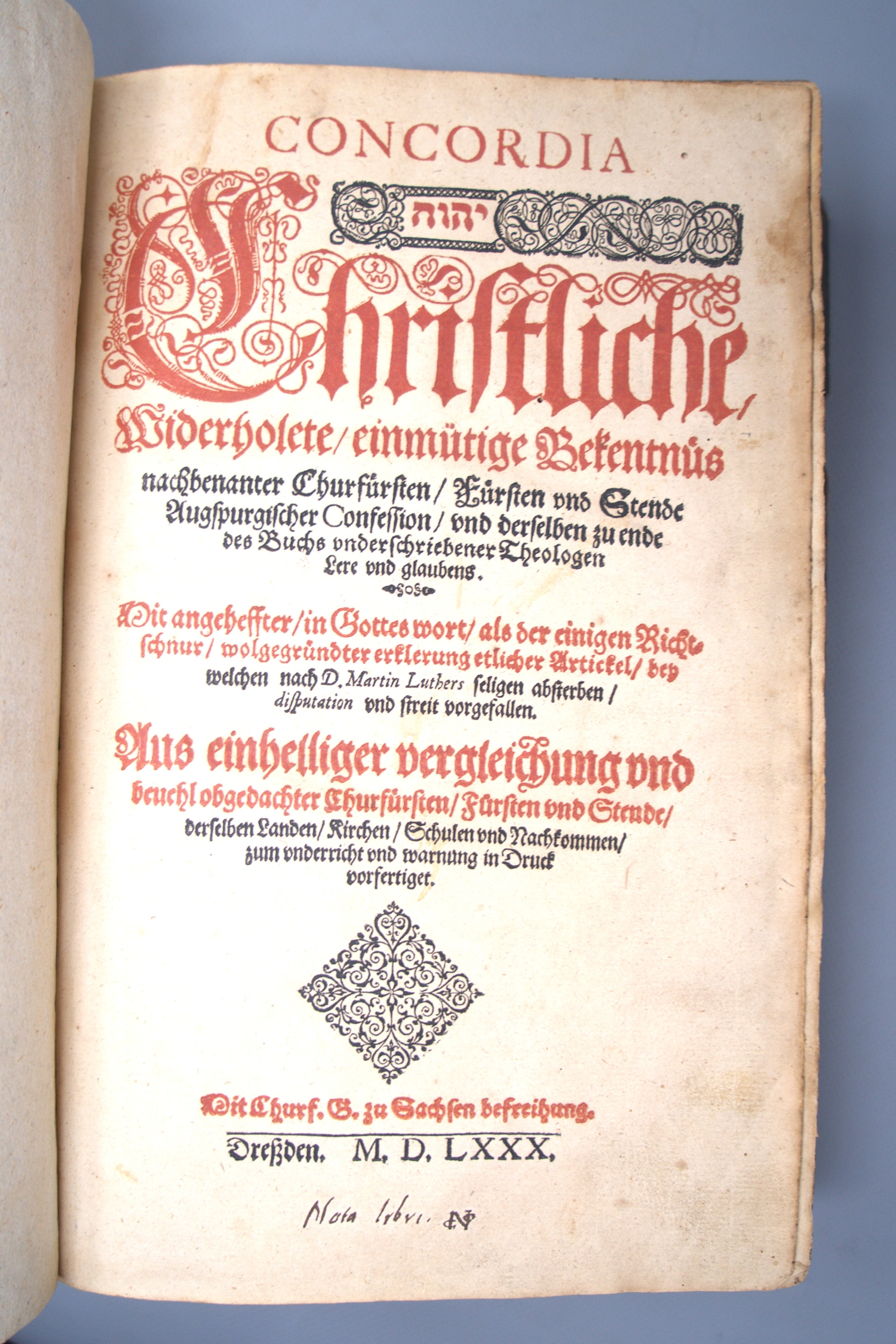 Concordia. Christliche, widerholete, einmütige Bekentnüs nachbenanter Churfürsten, Fürsten und Stende Augspurgischer Confession, und derselben zu Ende des Buchs underschriebener Theologen Lere und Glaubens. Mit angeheffter wolgegründter Erklerung etlicher Artickel, bey welchen nach D. M. Luthers seligen Absterben, Disputation und Streit vorgefallen. 2 Teile in 1 Band. 12 nn., 330 num., 1 w., 30 nn. Bl.; XXIIII num. Bl. Titel in Rot und Schwarz. 31 x 19,5 cm. Blindgeprägter Schweinslederband d. Z. (stärkere Gebrauchsspuren, Bezug stellenweise gelöst und mit Kalkweiß überstrichen; ohne die Schließen). Dresden, Matthes Stöckel d. Ä. und Gimel Berg d. Ä., 1579-1580.