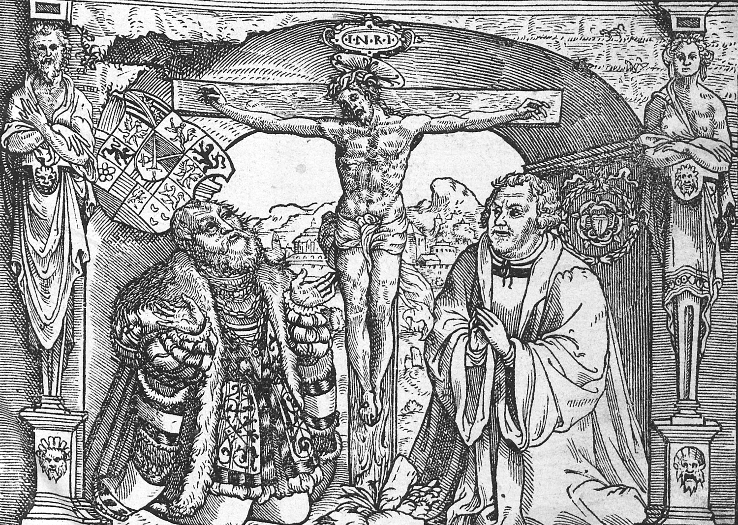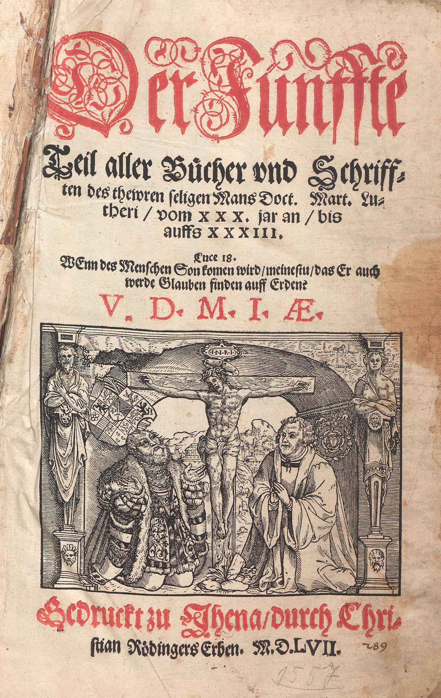 Luther, Martin. Der fünffte Teil aller Bücher und Schrifften...vom XXX jar an, bis auffs XXXIII. Mit Titelholzschnitt und 1 ganzseitigen, dreifachen Porträt-Holzschnitt. 6 Bl., 569 S., 1 Bl. 32 x 20 cm. Blindgeprägtes Schweinsleder (Bezug etwas fleckig und gebräunt) über Holzdeckel auf 4 Bünden mit 3 figürl. Rollen (Sündenfall, Verkündigung Jakob und Raphael Taufe-Auferstehung, Salvator-David-Paulus-Johannes, 4 Reformatorenköpfe) sowie jeweils 4 Eckbeschlägen auf den Deckeln und 2 Metallschließen. Jena, Erben Christian Rödinger, 1557.
