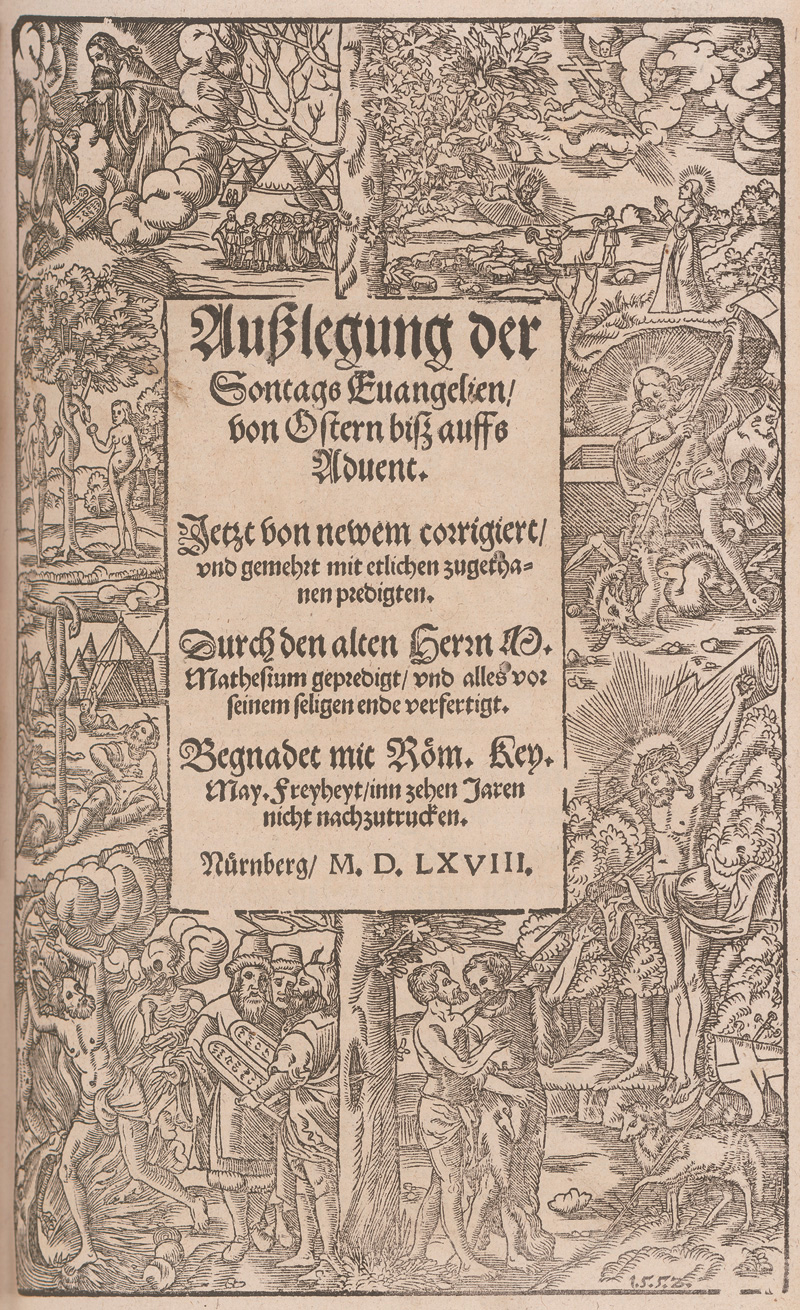Mathesius, Johannes. Postilla Das ist, Außlegung der Sontags und fürnembsten Fest Evangelien, uber das gantze jar. Jetzt von newem Corrigiert, unnd gemehrt mit etlichen zugethanen Predigten, unnd notwendigen Concordantzen. 4 Teile in 1 Band. 4 nn., CXLIIII num. Bl.; CCXII num. Bl.; CLXII num. Bl.; CXI num., 1 nn. Bl. Titel in Rot und Schwarz. Mit 3 (2 wiederholten) szenischen Holzschnitt-Bordüren, 3 (wiederholten) Holzschnitt-Druckermarken und 88 Textholzschnitten von Hans Brosamer u. a. 31 x 18,5 cm. Holzdeckelband d. Z. mit blindgeprägtem Schweinslederrücken (etwas fleckig und berieben, leicht wurmstichig, Lederbezug teils gelöst, Ecken teils beschabt) und Bezugspapier aus einer zeitgenössischen Handschrift sowie 2 intakten Messingschließen. Nürnberg, Erben Johann Berg, 1567-1568.