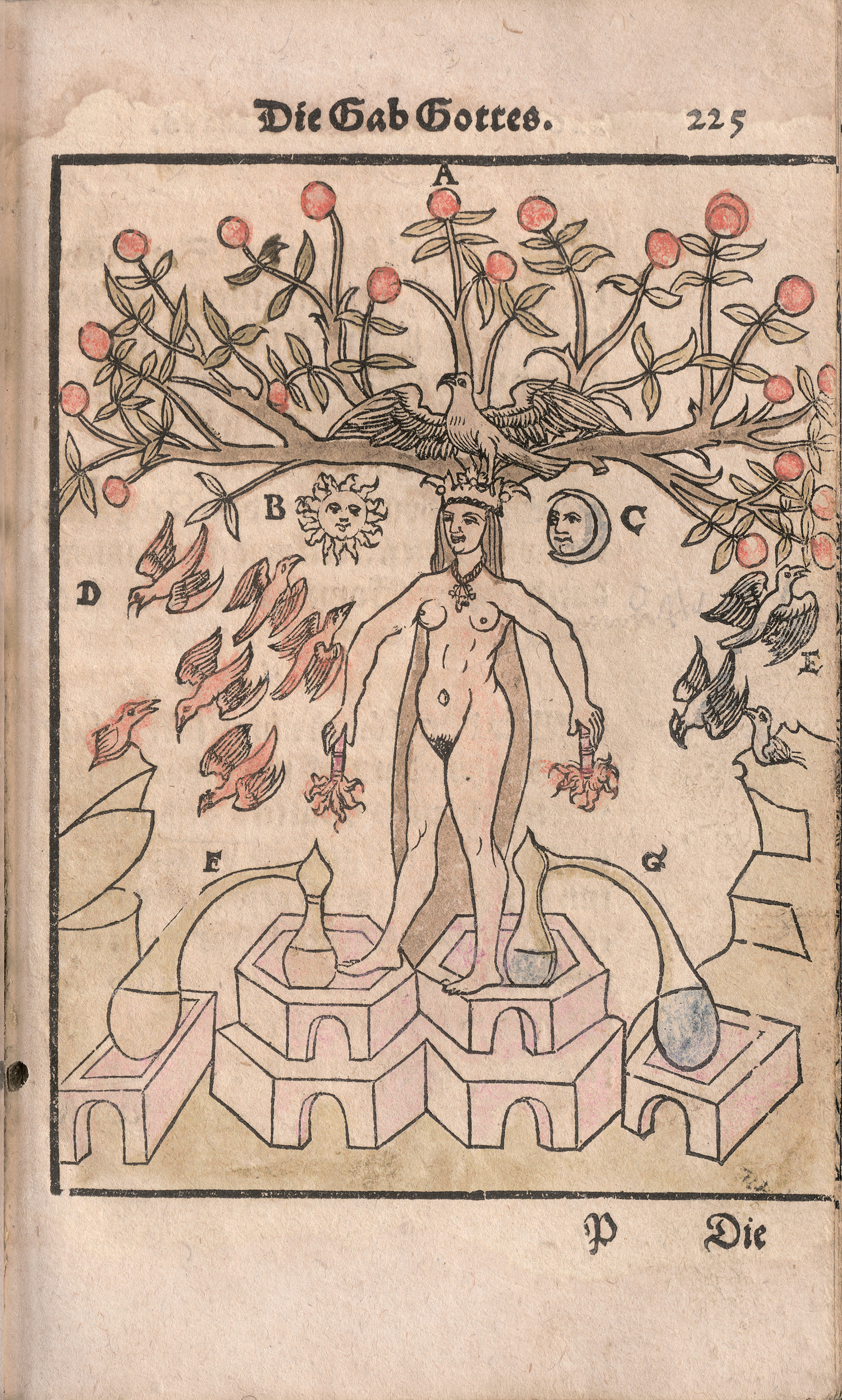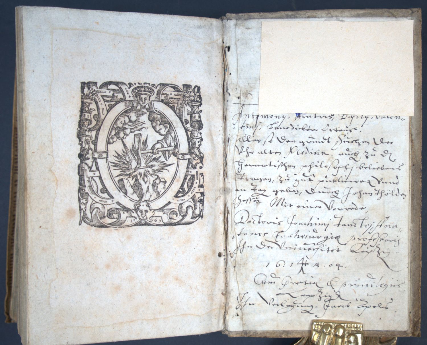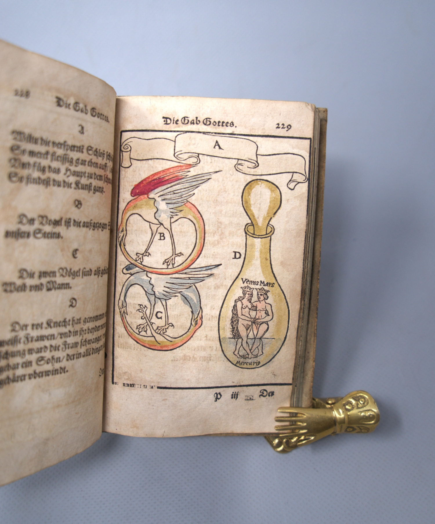 VD16 R 1363. Sudhoff, Paracelsus S. 334-335. Ferguson II, 258-59. Weller 173. Duveen 504-505. – Zweite Ausgabe (Erstausgabe 1582) dieses außerordentlich seltenen alchemistischen Werkes mit seiner bemerkenswert reichen und qualitativ hochwertigen Illustration, "...of great interest for the symbolical pictures it contains" (Ferguson). Der unter dem Namen Franciscus Epimethus geführte Verfasser wird nach Fictuld (Probierstein 1753, S. 118) mit dem Franziskaner Ulmannus identifiziert. Ein Teil der Bildfolge erschien bereits 1572 in der "Ars Amifera". Die von Hieronymus Reusner verfasste Vorrede bietet Erläuterungen paracelsischer Terminologie. – Titel mit zeitgenössischem Sepia-Besitzeintrag "Simon Schwartz" und Tintenfleck. Papierbedingt leicht gebräunt, insgesamt wohlerhalten und nur gelegentlich stockfleckig. Rechter Rand etwas knapp beschnitten (ohne Textverlust, aber teils leicht über die Umfassungslinie der Holzschnitte). Die Holzschnitte wurden durchgehend recht hübsch koloriert, möglicherweise etwas später. Bibliotheksstempel "Stadtbücherei Elbing" auf Innenspiegel sowie Titelblatt verso; recto ein weiterer Stempel.