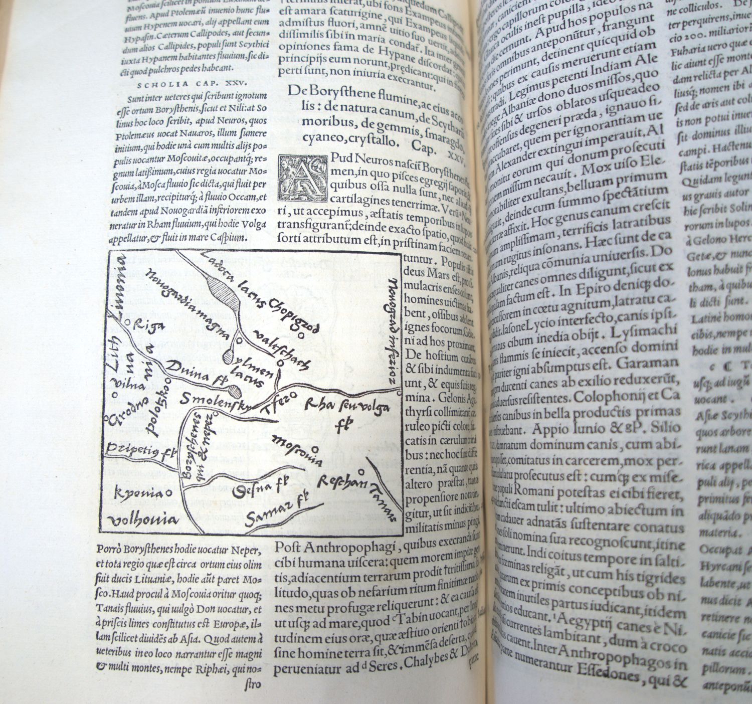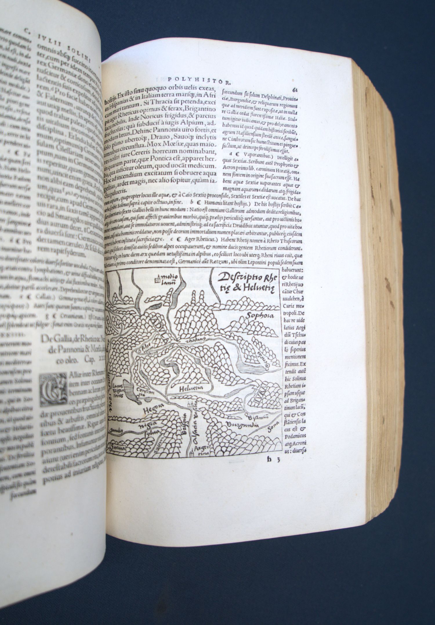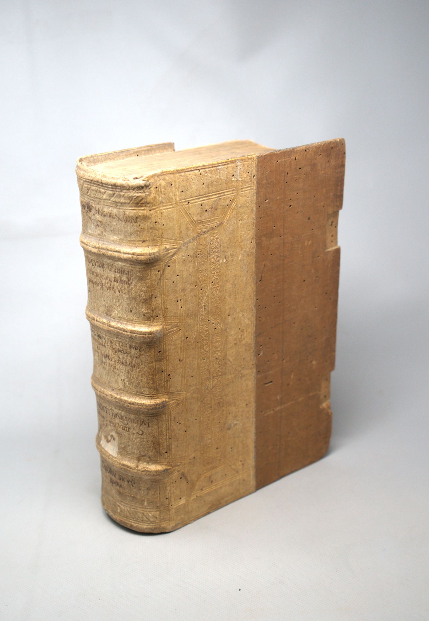 Sammelband. 5 Schriften von zum Beispiel Herodot, Thukydides oder Gaius Julius Solinus. 31 x 19,5 cm. Holzdeckel (mit Wurmlöchern, Fehlstellen, RDeckel fehlt sowie ohne die Schließen) mit blindgeprägtem Schweinsleder Rücken (berieben und mit Wurmlöchern). Verschiedene Orte und Verlage 1527-1538.