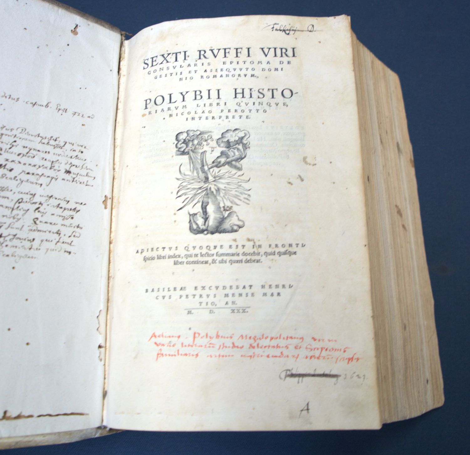 Vorhanden sind : I. Rufius Festus. Sexti ruffi viri consularis epitoma de gestis et assequuto dominio romanorum. Polybii historiarum libri quinque, Nicolao Perotto Interprete. 8 Bl., 198 S. Mit Holzschnitt-Druckermarke auf dem Titel. Basel, Petri, 1530. - II. Thukydides. Laurentio valla interprete & nunc a conrado heres bachio ad graecum exemplar di ligentissime recogniti. 6 Bl., 234 S. Mit Holzschnitt-Titelbordüre. Köln, Eucharius Cervicornus, 1527. - VD16 T 1117. - III. Gaius Julius Solinus. Pomponii melae de situ orbis libros tres, fide diligentiaque summa recognitos, adiunximus. 9 Bl., 230 S. Mit 3 (1 doppelblattgroß) Holzschnittkarten im Text. Basel, Michael Isingrinius und Henrich Petri, 1538. -VD16 S 6968. - IV. Herodot. Historiographi libri novem, musarum nomi nibus inscripti, interprete laurentio valla. 14 Bl., 274 S. Mit Holzschnitttitelbordüre. Köln, Eucharius Cervicornus, 1537. - VD16 H 2510. - V. Diodorus Siculus. En damus diodori siculi historici graeci, quae nunc quidem extare noscuntur opera nempe. 12 Bl., 374 S. Mit Holzschnitt-Druckermarke am Schluss. Basel, Henrich Petri, 1530.