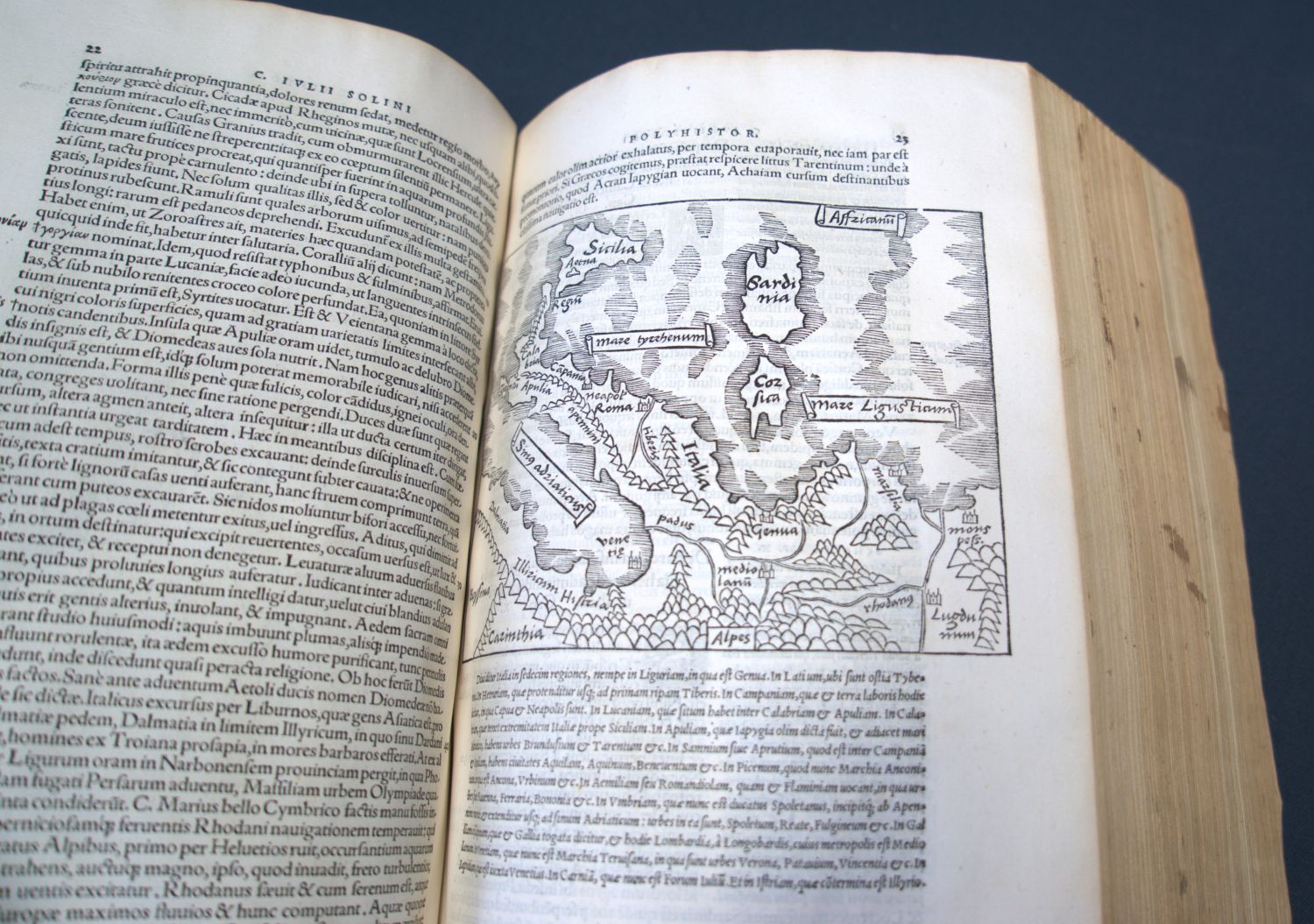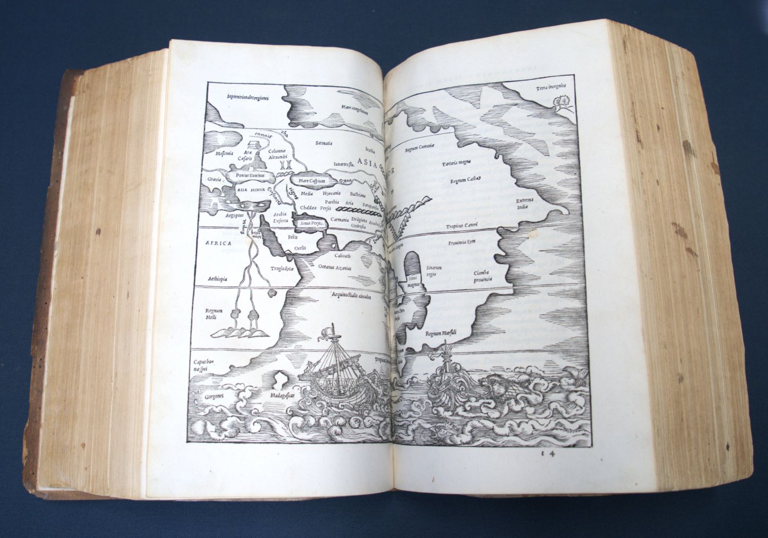 Besonders bemerkenswert ist die hübsche Holzschnittkarte, die den Mittelmeerraum mit zwei Schiffsstaffagen zeigt. – Mit Exlibris auf dem Vorsatz. Erster Titel mit hs. Besitzvermerken und etwas gebräunt. Insgesamt mit Wurmlöchern, knickspurig und vereinzelt leicht fleckig.