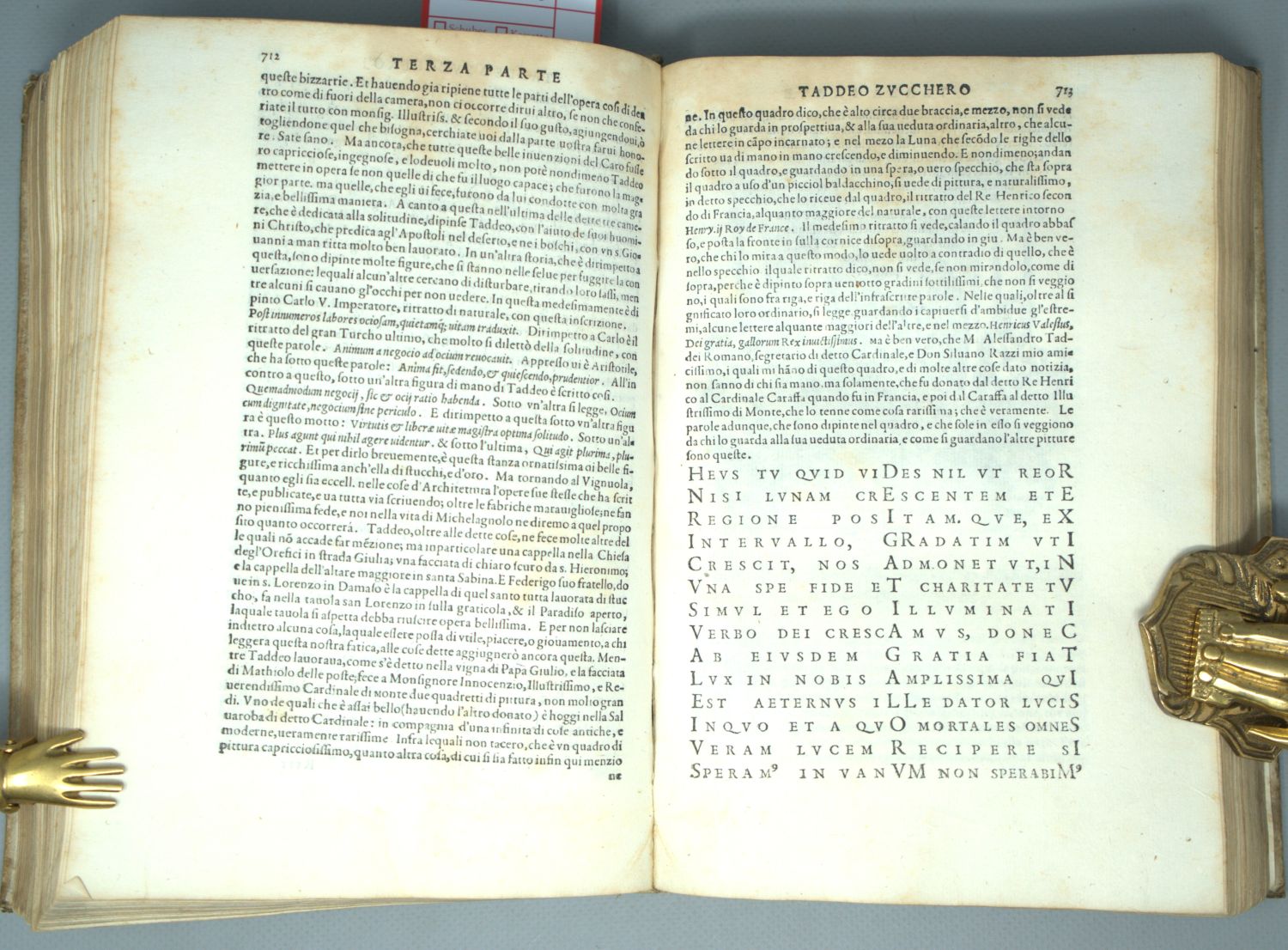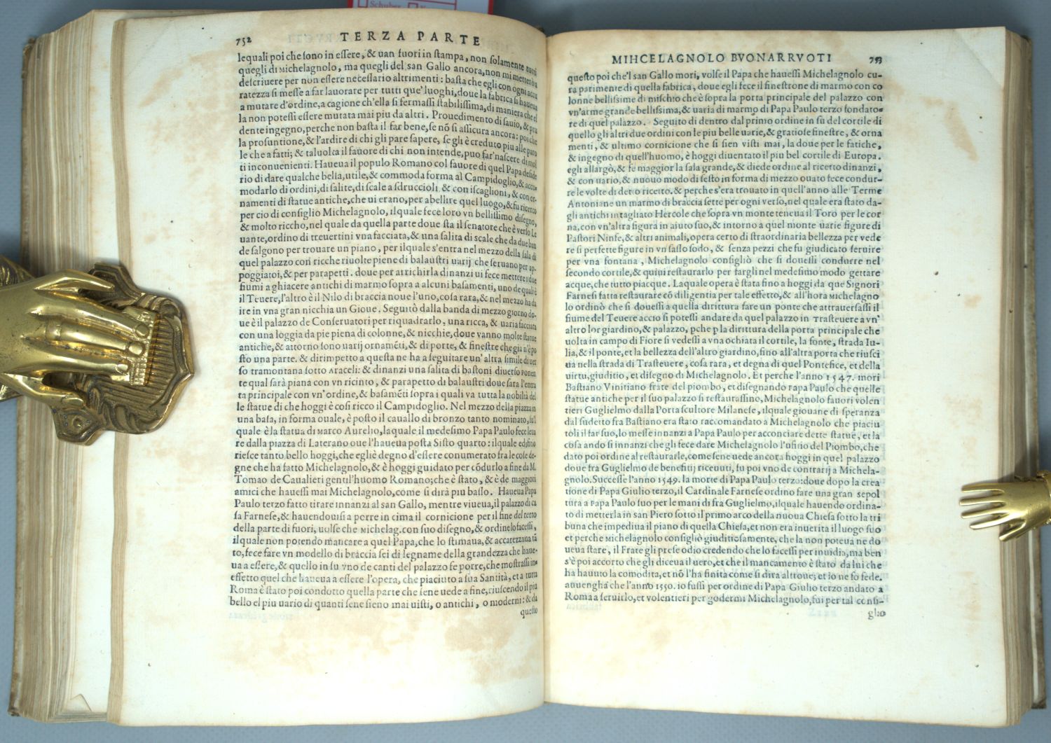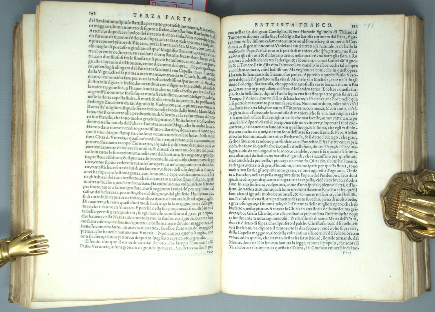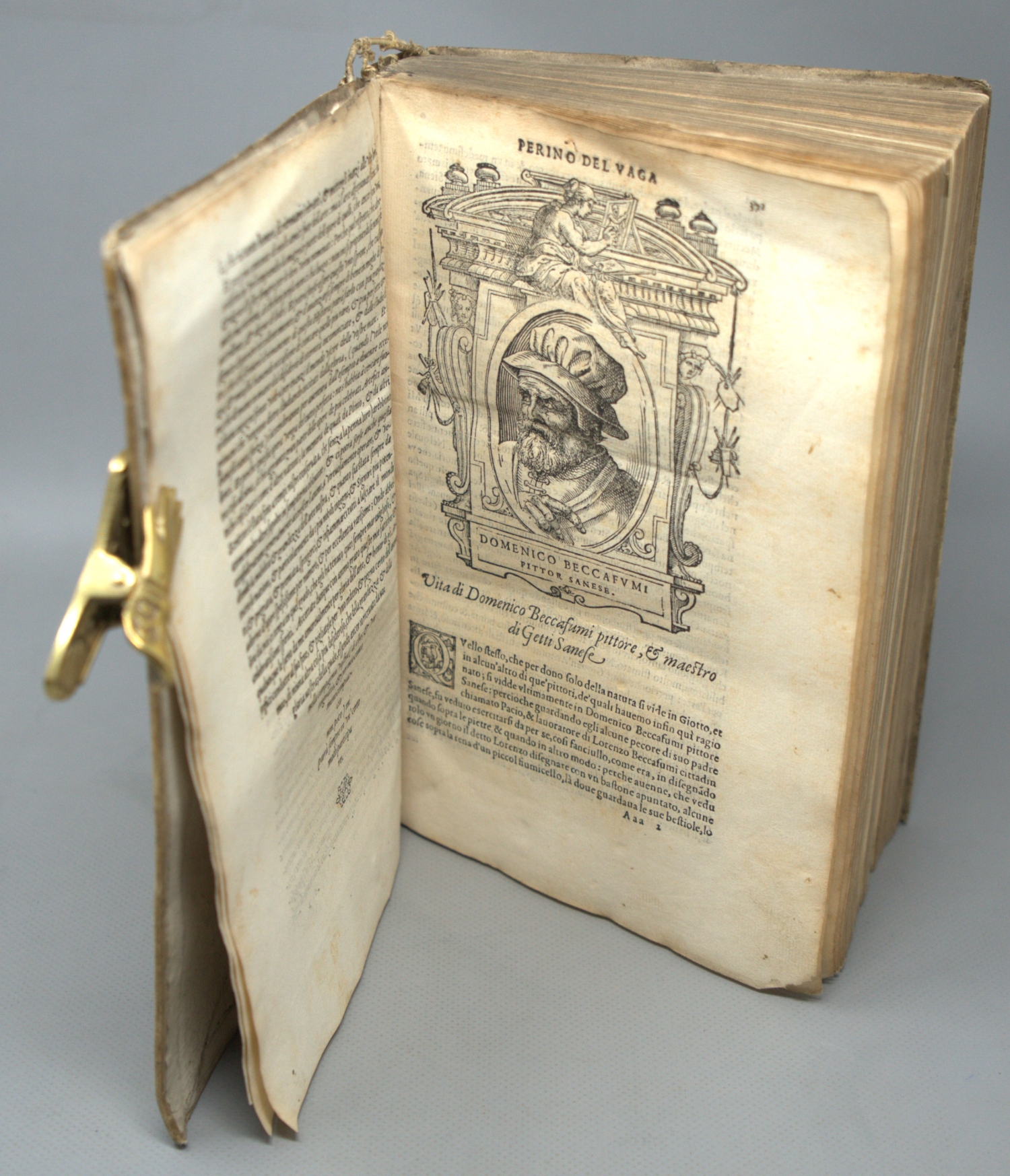 Vorliegt hier des dritten Bandes zweiter und letzter Teil, der bedeutendste des Werkes, der die Viten und Porträts enthält von Domenico Baccio Bandinelli, Bassano, Beccafumi, Girolamo da Carpi, Giacopo da Pontormo, Francesco Primaticcio, Francesco Salviati, Giacopo Sansovino, Giovannantonio Sodoma, Taddeo Zucchero, aber vor allem die Viten der beiden bedeutensten Künstler Italiens im 16. Jahrhundert: Die Vita Tiziano Vecellio und die allein 82 Seiten umfassende und damit umfangreichste und erste Künstlerbiographie Michelangelo Buonarrotis. Auch seine eigene Lebensbeschreibung brachte Vasari in diesem Band unter: "Descrizione dell'opere di Giorgio Vasari, pittore, & architetto aretino". – Der einigen Exemplaren beigegebene Block mit 40 zusätzlichen Blättern (meist am Anfang nach Titel und Vorbemerkung eingebunden, aber oft auch dem ersten Band des Gesamtwerkes oder als Einzelband beigebunden) fehlt hier. Er enthält zusätzliche Register (“Tavola delle cose più notevoli…”, “Tavola dei luoghi”, "Lettera di M. Giovambatista di M. Marcello Adriani"; *-*****4 a-e4).