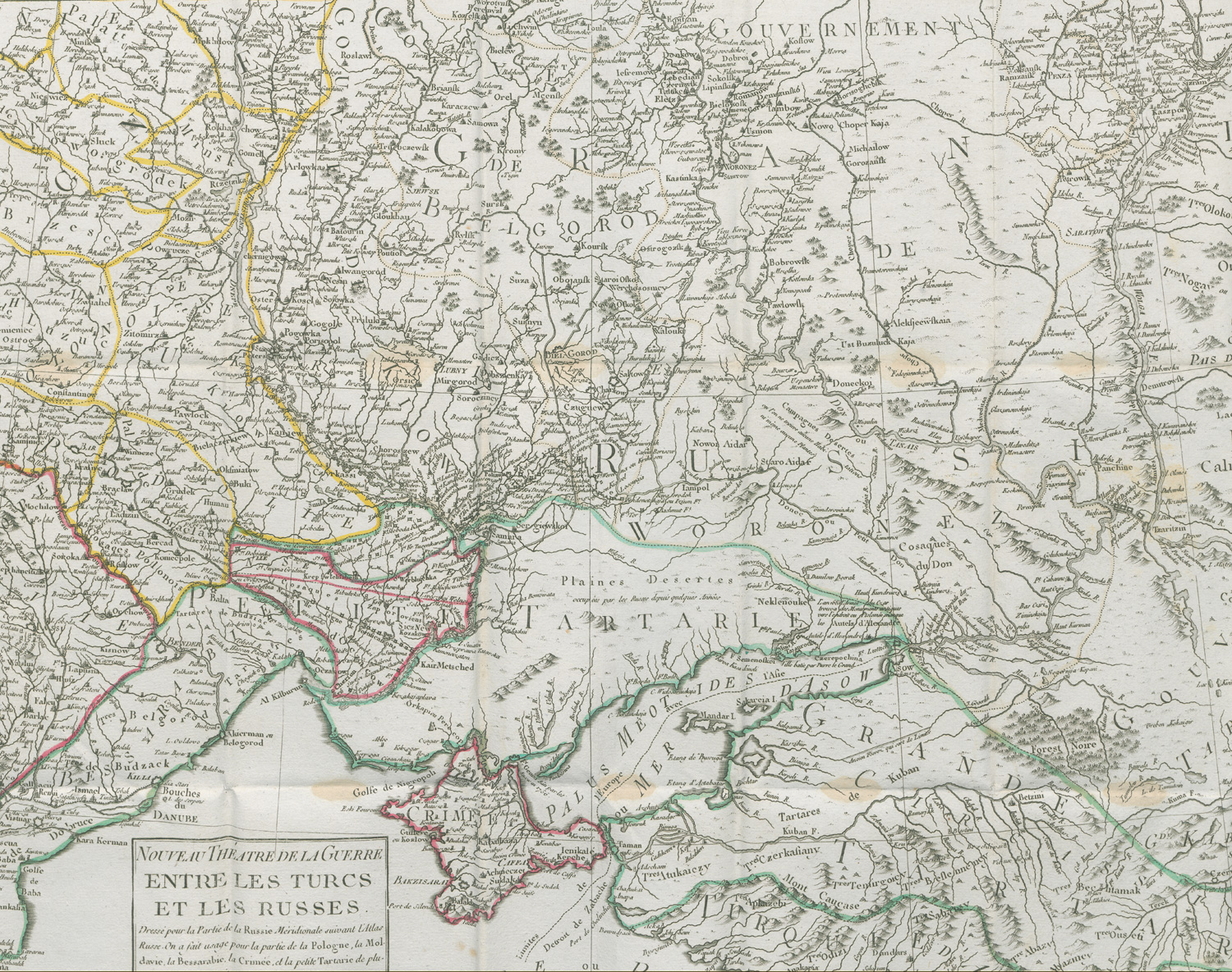Buret de Longchamps, Pierre-Nicolas. Nouveau Théatre de la guerre entre les Turcs et les Russes. Grenzkolorierte Kupferkarte. 52,5 x 76 cm (Plattenrand). Im Pappumschlag (berieben und fleckig) mit montiertem TSchild. Paris 1787.