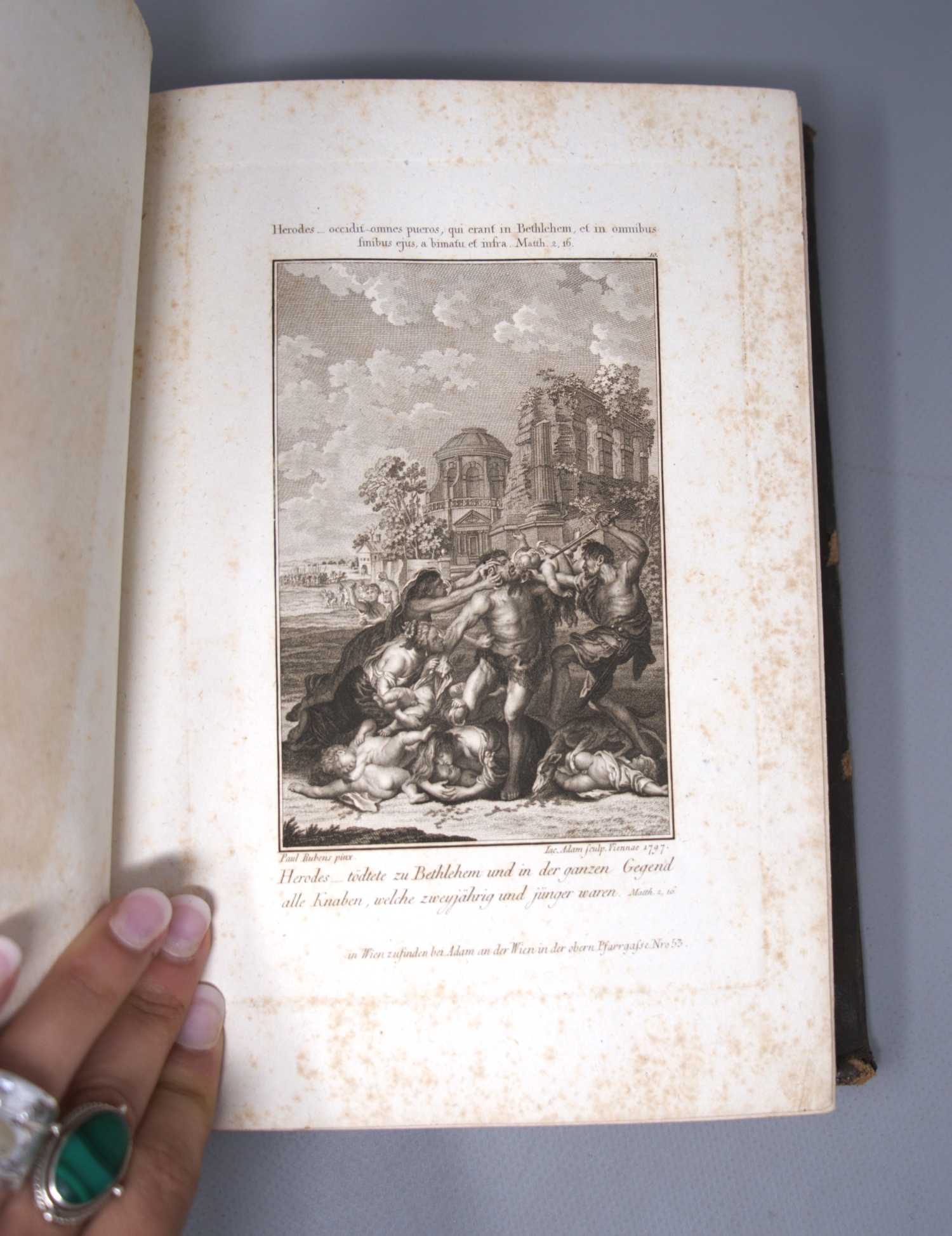 Tafeln oben und unten mit Paralleltext in deutscher und lateinischer Sprache. – Fliegende Vorsätze mit d. Exlibris von Franz Sandkühler. Im weißen Rand mal mehr, mal weniger stockfleckig.