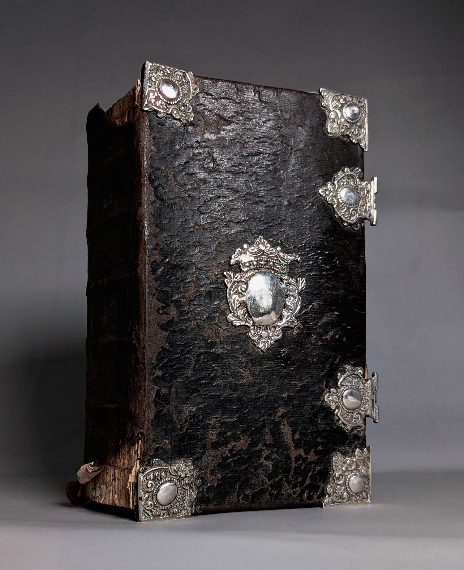 Dekorativer Silbereinband mit massiven Eckbeschlägen und Wappenverzierung als Mittelstück in massivem Silber. Die Schließen innen mit dem Monogramm "G. C. Jg.", womöglich für die sich hs. am Anfang nennende erste Eignerin: "Gusche Christina Jürgens gehöret diese BIEBEL Holdorff d. 30ten März 1820". Untere Schließe innen mit Punktierschrift die Gewichtsangabe "Wiegt 12 1/4 Loth" (entspricht etwa 120g). – Bezugsleder brüchig, Kapitale mit größeren Fehlstellen, Silberbeschläge kaum oxidiert. - Inhalt: Die Bibel, oder die ganze heilige Schrift des alten und neuen Tesatments. 2 Teile in 1 Band. 1079; 308 S. Mit zahlreichen kolorierten Kupfertafeln. Halle, Canstteinische Bibel-Anstalt, 1811. - Mehrere Tafeln lose, Block stellenweise etwas ausgebunden. Vorsatz mit hs. Besitzeintrag d. Z. Wenige Gebrauchsspuren. Nicht kollationiert.