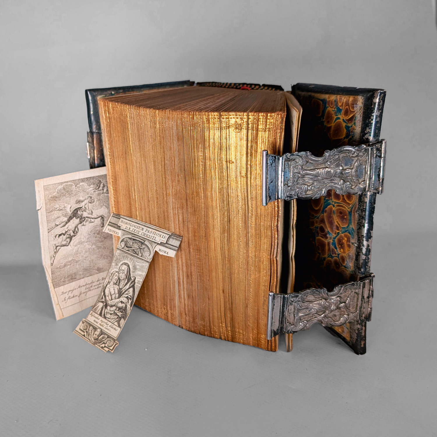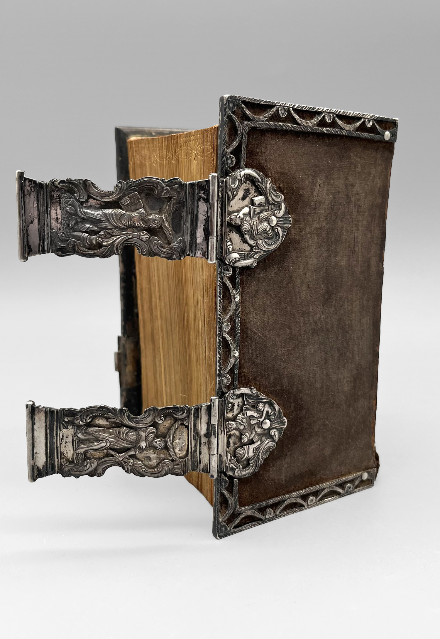 Prachtvoller Silbereinband mit zwei mächtigen Silberschließen, auf denen sich je drei von Rocaillen umgebene Allegorien befinden, darunter Fides, Caritas, Spes, Vanitas und Justitia. Auf den Schließen monogrammiert "A. B." und mit einer Gewichtsangabe "Wiegt 10 3/8 Lood" (entspricht etwa 100g). – Gelenke brüchig, Rücken mit Fehlstellen, lädiert, Samt teils stärker abgerieben und beschabt. Das Silber teils oxidiert. - Inhalt: Biblia dat is de gantsche H. Schrifture ... des ouden en nieuwen Testaments. 3 Teile in 1 Band. 420; 132; 135 Bl. Mit zahlreichen Kupfertafeln. Haarlem, Enschede en Zoonen, 1796. - Beigebunden: zwei weitere niederländische theologische Schriften. - Gebrauchsspuren. Nicht kollationiert.
