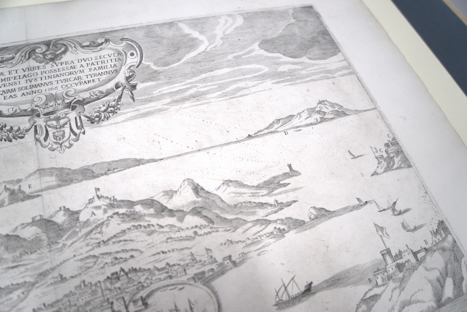 Chios. Insulae et urbes supra duo secula in archipelago possessae a patritia Genuensi. Kupferstich. 37,5 x 57 cm (Passepartout) bzw. 47,5 x 72,5 cm (Blatt). Mit Passepartout. Italien um 1630.