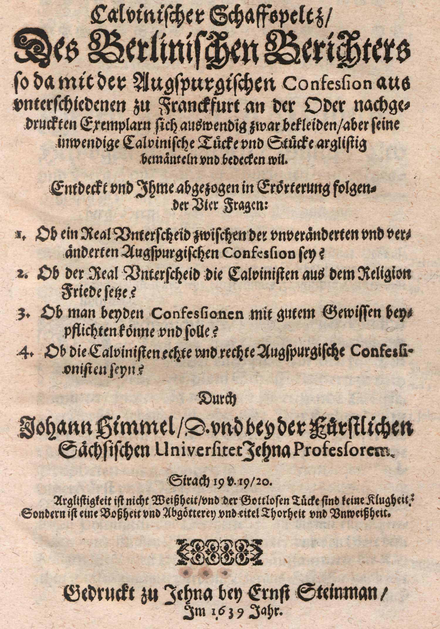 Himmel, Johann. Calvinistischer Schaffspeltz des berlinischen Berichters ... 8 Bl., 136 S. 19 x 14 cm. Modernes Halbpergament (leicht fleckig). Jena, Ernst Steinmann, 1639.