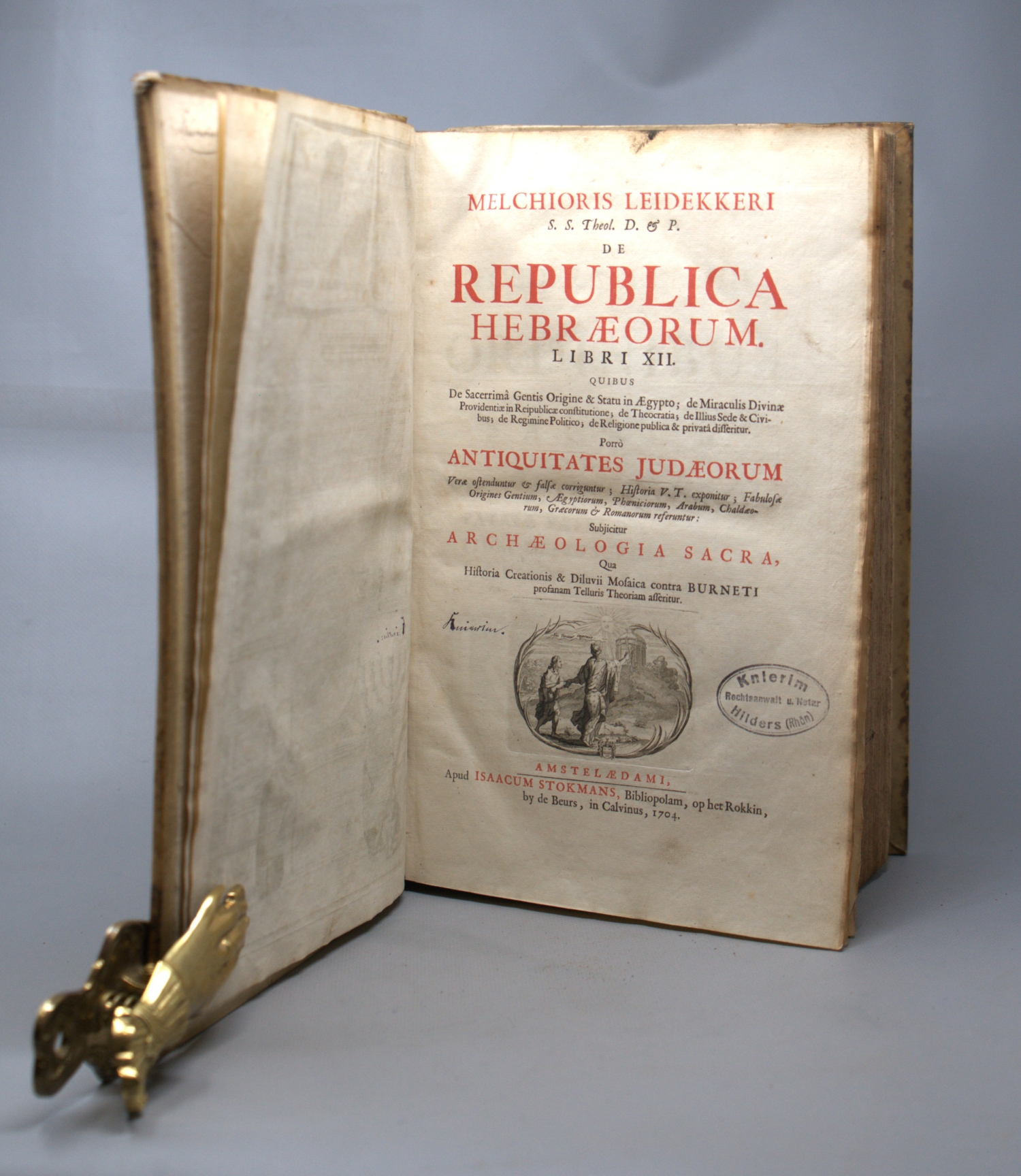 Leydecker, Melchior. De republica Hebraeorum libri XII. Porrò antiquitates Judaeorum. 5 Bl., 702, 96 S., 6 Bl. Titel in Rot und Schwarz. Mit Kupfertitel und gestochener Titelvignette (ohne das gestochene Portrait). 33,5 x 20,5 cm. Blindgeprägter Pergamentband d. Z. (fleckig und berieben, mit hs. RTitel). Amsterdam, Isaak Stokman, 1704.