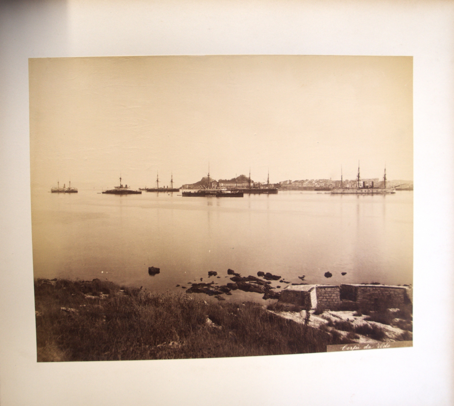 Schönes Souveniralbum mit zwölf größeren Ansichten (Format: ca. 21,5 x 24,5 cm) des Hauptortes Kerkyra und seines Hafens, Schloss Mon Repos auf der Kanoni-Halbinsel, der Siedlung Potamos ("Fotografia B. Rorri"), ferner von der vorgelagerten Insel Pontikonissi, Paliokastro etc. Am Schluss mit drei Darstellungen lokaler Bewohner in der traditionellen Inseltracht, diese im kleineren Format (ca. 13,5 x 9,5 cm). Auf dem fl. Vorsatz aus Seidenmoiree in Golddruck "Weihnachten E. R. 1889" – Die Photos teils etwas berieben.