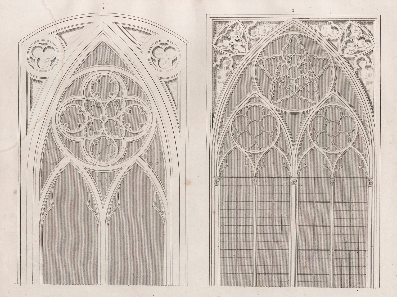 Möllinger, Karl (Hrsg.). Elemente des Spitzbogenstiles systematisch entwickelt nach den vorzüglichsten Bau- und Kunstdenkmälern aus der Glanzperiode des Mittelalters; für Schulen und zum Selbstunterrichte für Architekten, Maler, Bildhauer und Steinmetzen, überhaupt für alle Techniker, die sich mit dem Baufache beschäftigen. 2 Bände. Textband (1. Heft und Erklärung der Tafeln) und Tafelband (beinhaltet die Tafeln der Hefte 1-7). 112 S., 2 Bl., 31 S.; 1 Bl. Mit 84 Kupfertafeln. 29,5 x 23 cm. Pappband d. Z. (beschabt und bestoßen, Kapitale mit Einrissen bzw. fehlen teils) mit montiertem TSchild auf dem DTitel. München, Emil Roller, 1845.
