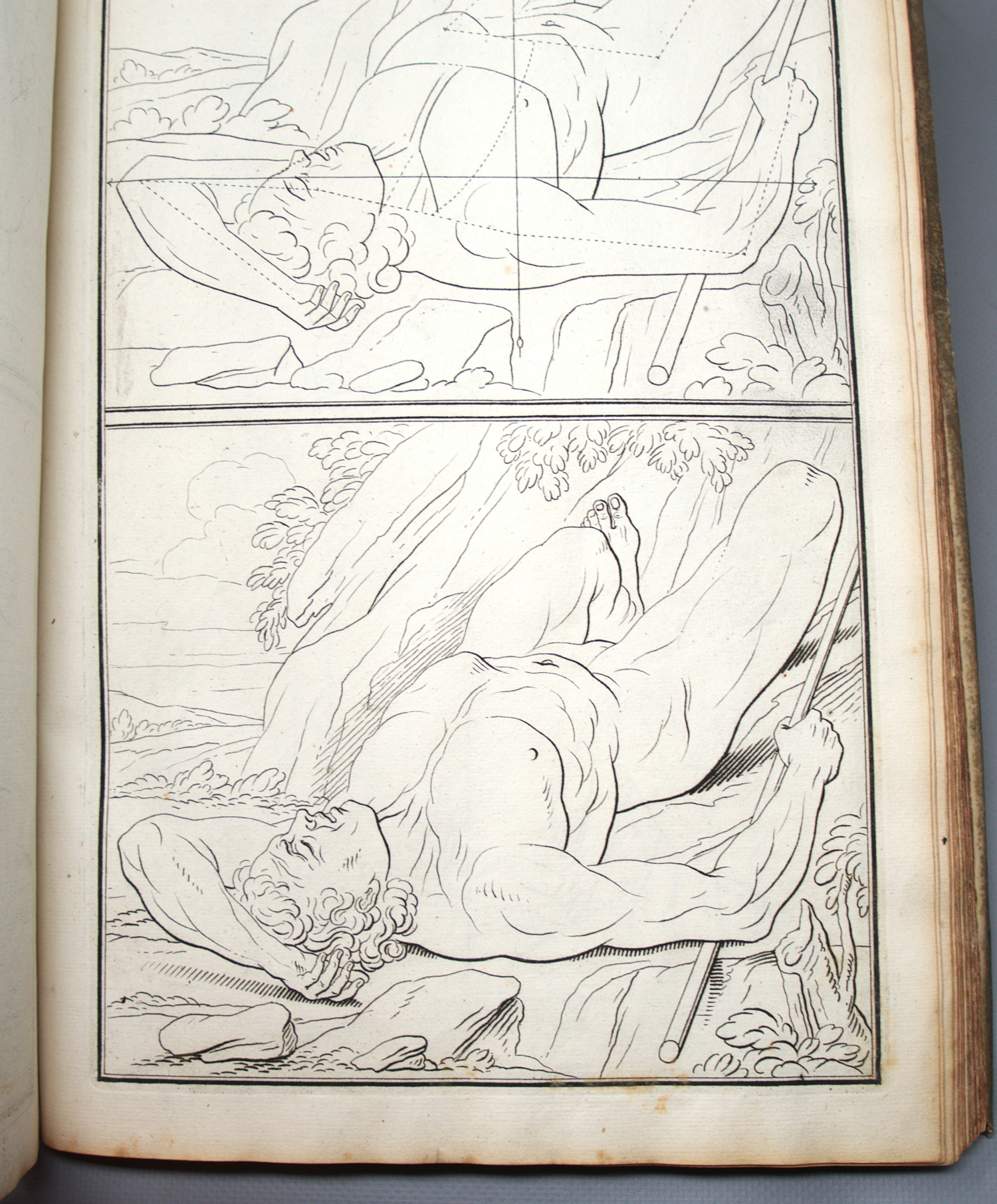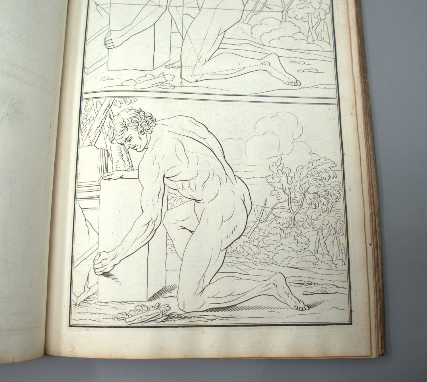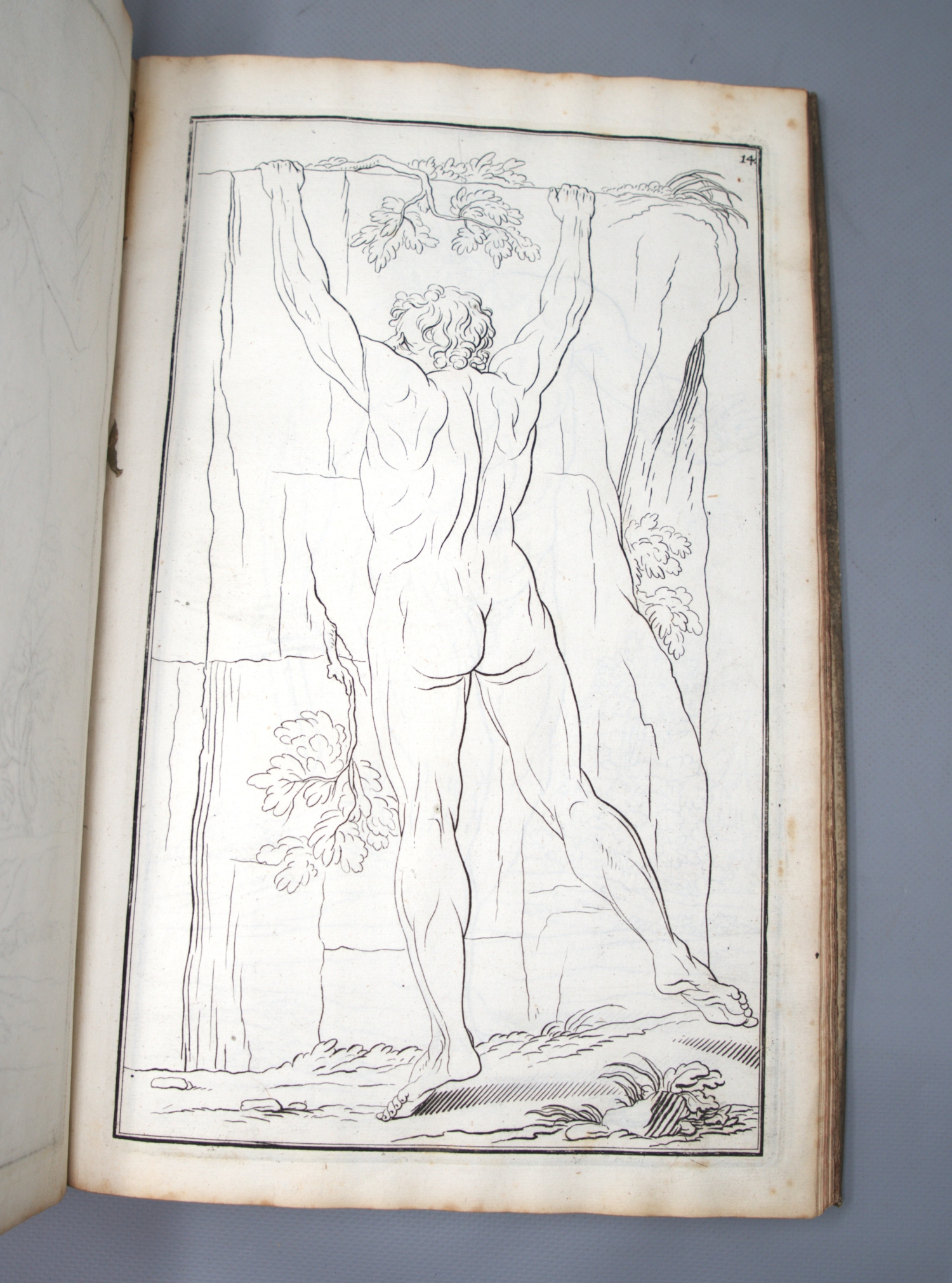 Thieme-Becker XXVII, 373f. Vgl. Berliner Ornamentstichsammlung 4628. – Seltene erste Ausgabe. Lehrbuch für Künstler mit zahlreichen anatomischen Beispieltafeln, in denen die Proportionen des menschlichen Körpers detailliert ausgerechnet und dargestellt werden. Der Autor und Künstler Johann Daniel Preissler (1666-1737) kam aus einer einer böhmischen Glasmacher- und Malerfamilie. Er ging sowohl bei seinem Vater Daniel Preissler als auch bei Johann Murrer in die Lehre und war von 1705 an Direktor der Nürnberger Kunstakademie. – Vorderer und hinterer Innensteg leicht offen. Stock- und fingerfleckig, feuchtrandig und mit kleinen Randeinrissen. – Beigebunden: Carlo Cesi. L'Anatomia dei pittori. Das ist, deutliche Anweisung und gründliche Vorstellung von der Anatomie der Mahler. Andere Auflage. 2 Bl. 16 Kupfertafeln. Nürnberg, Johann Preißler, 1732.