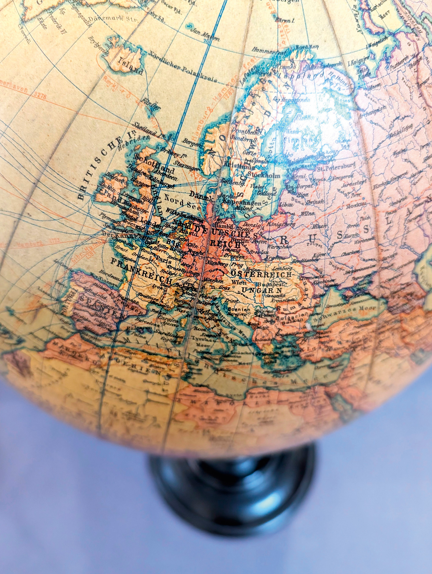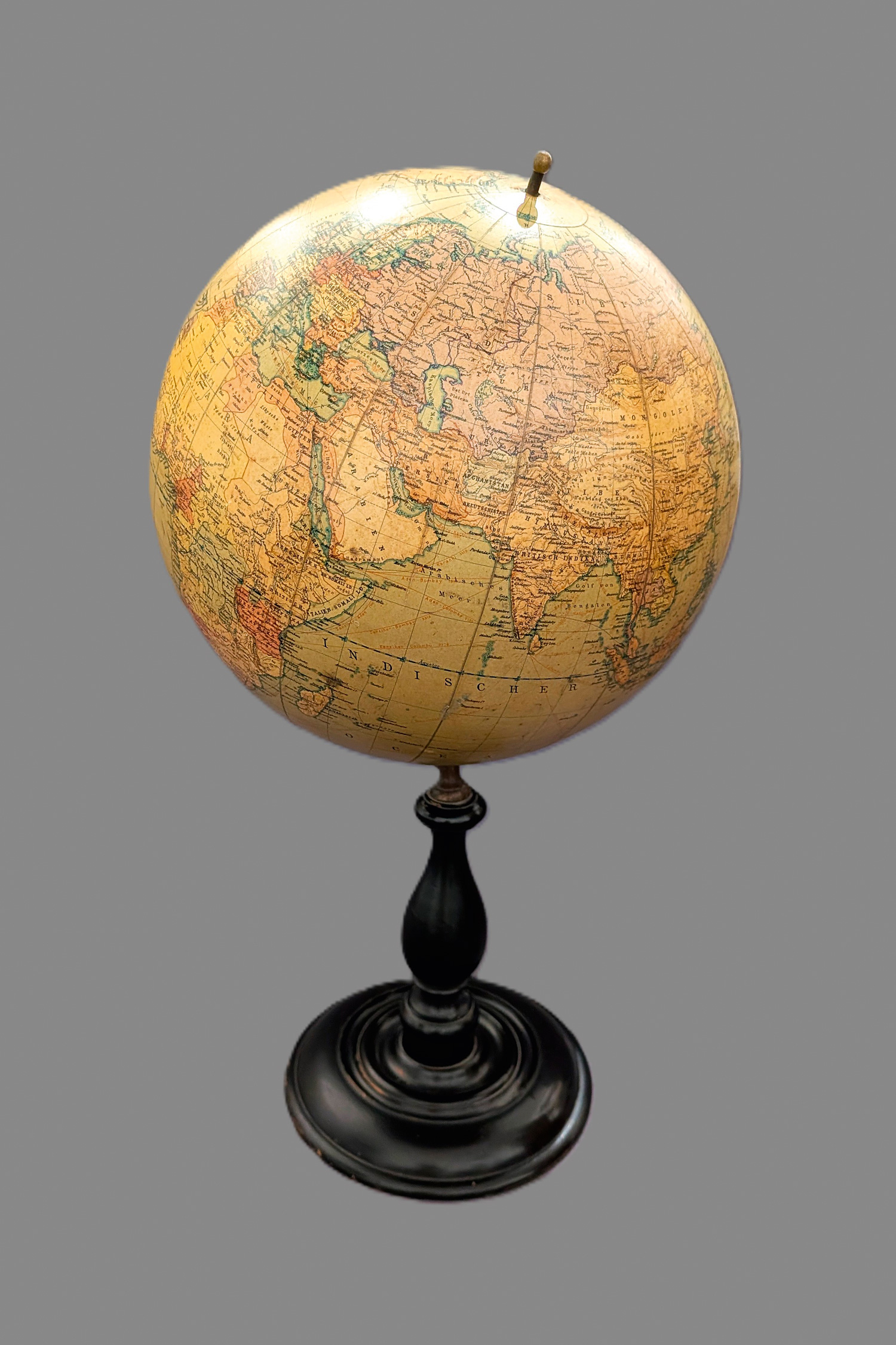 Sehr dekorativer Erdglobus mit deutschsprachiger Beschriftung aus der Produktion des Kartographischen Instituts Dietrich Reimers in Berlin. – Altersbedingte Patina. Leicht bestoßen fleckig und abgegriffen, Sockel gering berieben.
