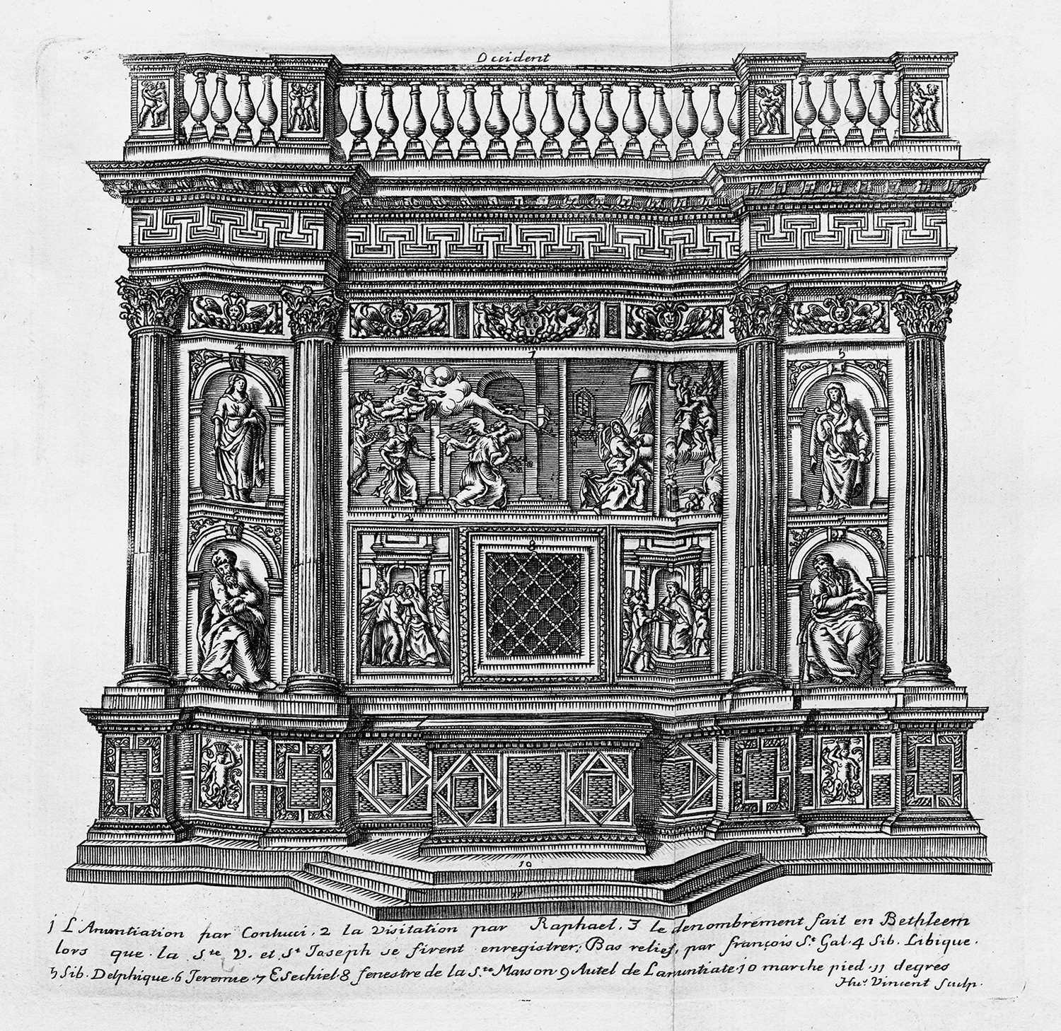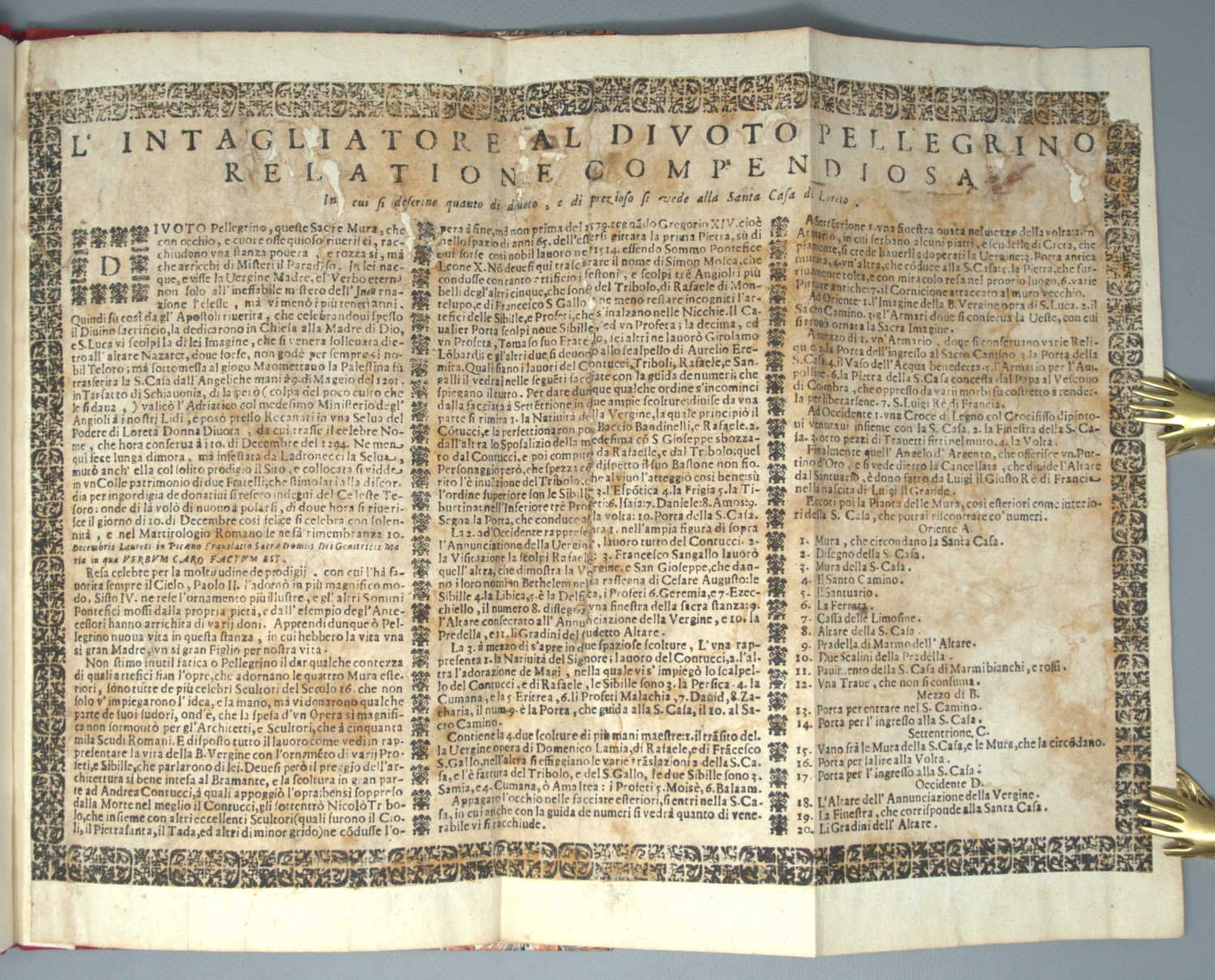 Berliner Ornamentstichkatalog 2674. Nagler XXIII, 33 (datiert 1683). Nicht bei Guilmard. – Nach dem Petersdom in Rom ist Loreto der zweitwichtigste Wallfahrtsort in Italien und einer der wichtigsten der katholischen Welt. Die Basilika vom Heiligen Haus beinhaltet die Santa Casa, der Legende nach das Heilige Haus von Nazaret, in dem Maria aufwuchs und die Verkündigung des Herrn empfing. – Das Erklärungsblatt gebräunt und wasserrandig, alt aufgezogen, die Kupfertafeln bemerkenswert breitrandig.