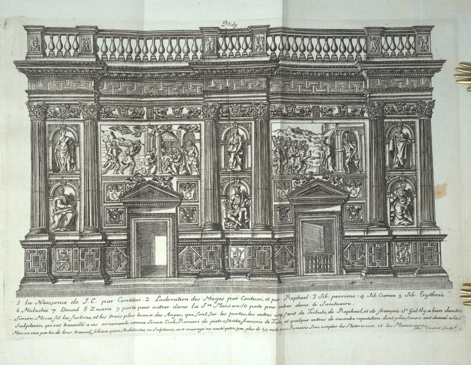 Vincent, Hubert. Die vier Seitenwände in "Santa Casa di Loretto". Mehrfach gefaltetes Erklärungsblatt (alt aufgezogen) und 4 gefaltete Kupfertafeln von H. Vincent. 31 x 21 cm. Neuerer Halblederband mit goldgeprägtem RTitel. (Rom 1686).