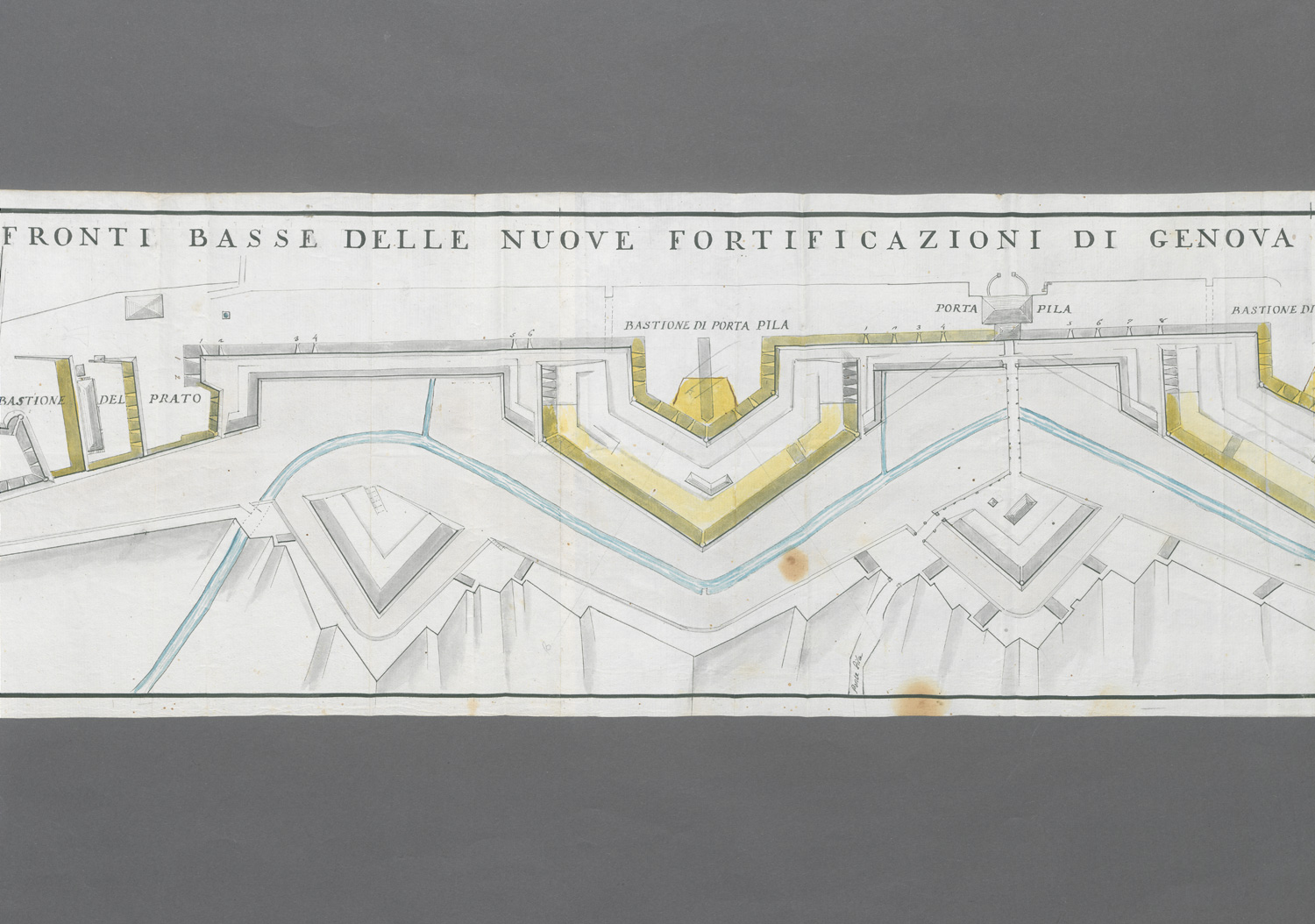 Genua. Fronti Basse delle nouove fortificazioni di genova verso la foce del bisagno. Teilkolorierte Zeichnung. 22,5 x 94,5 cm. Italien um 1800.
