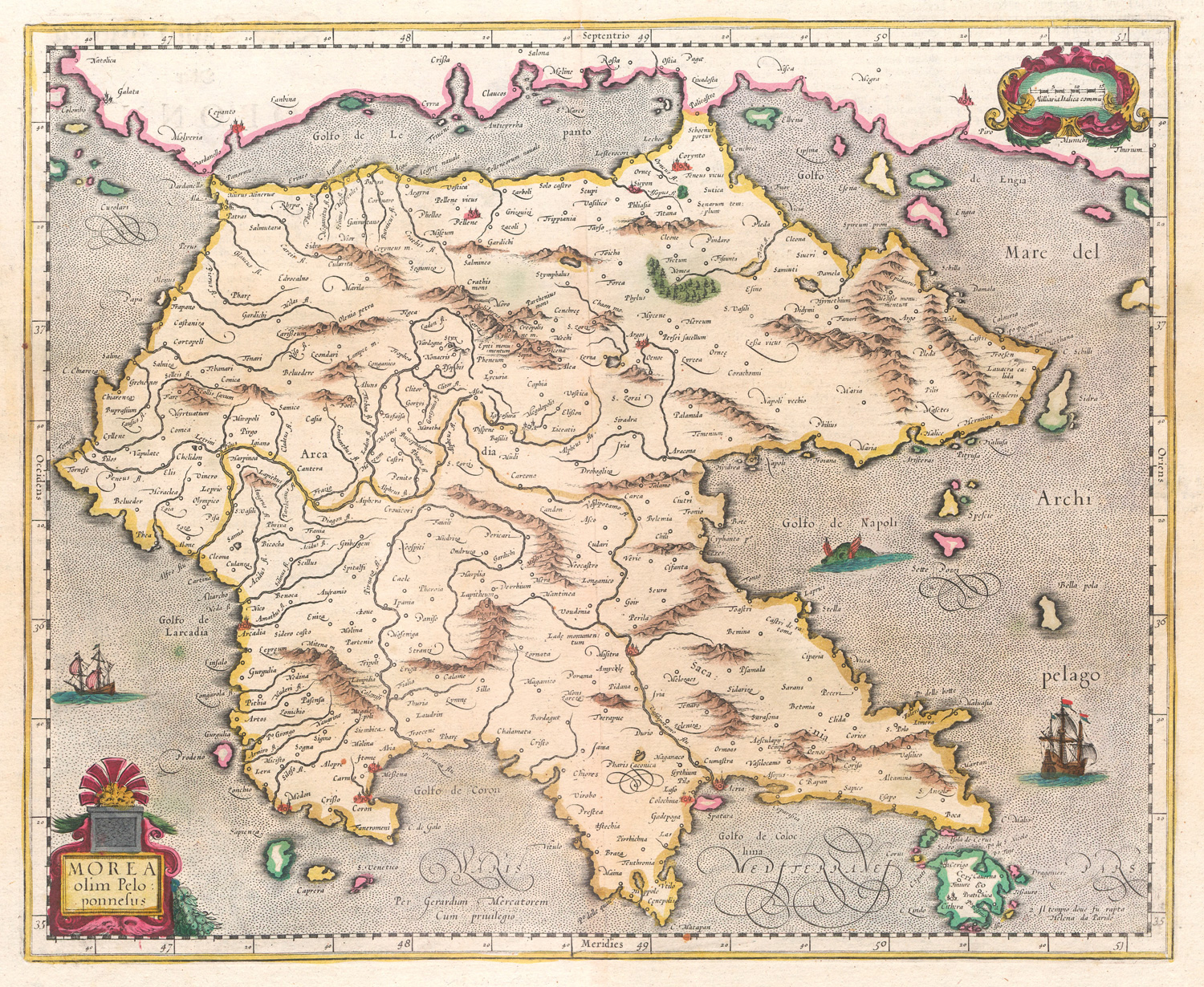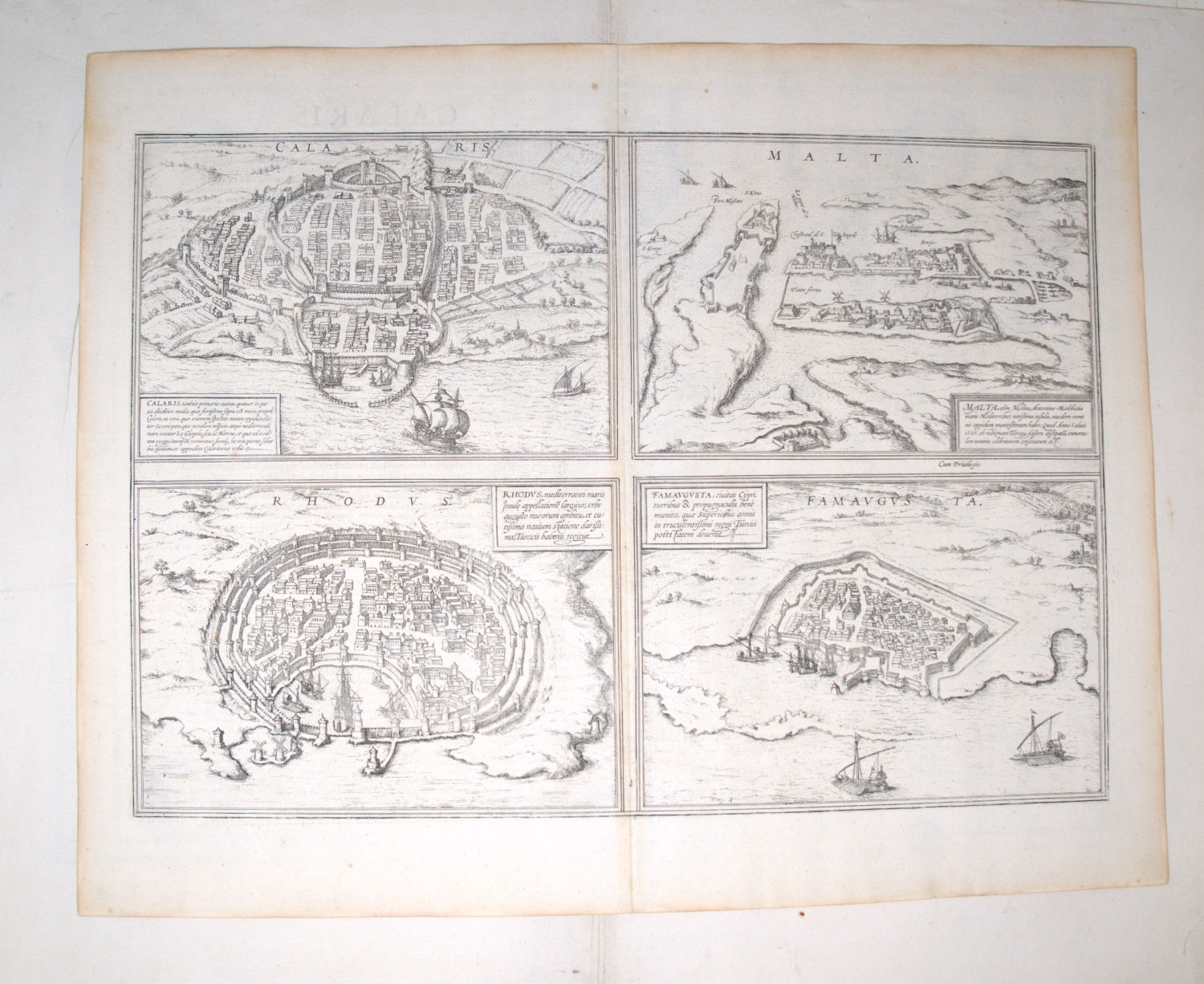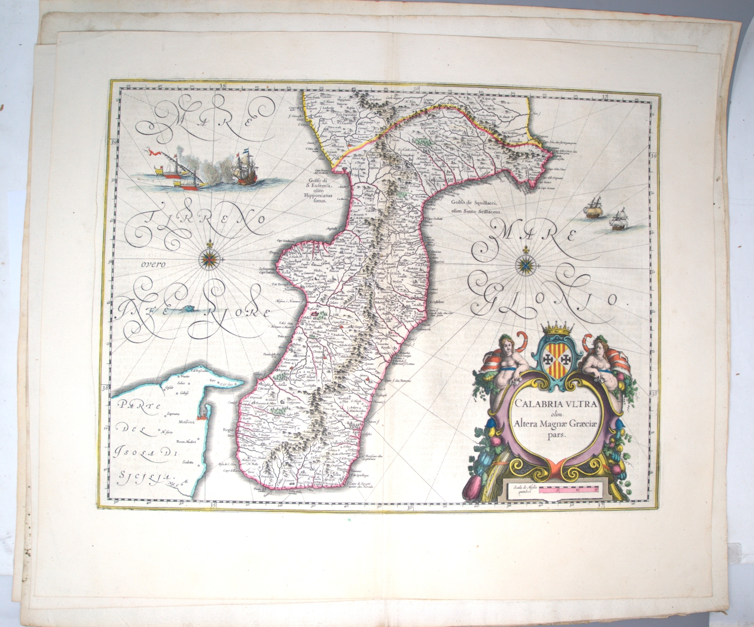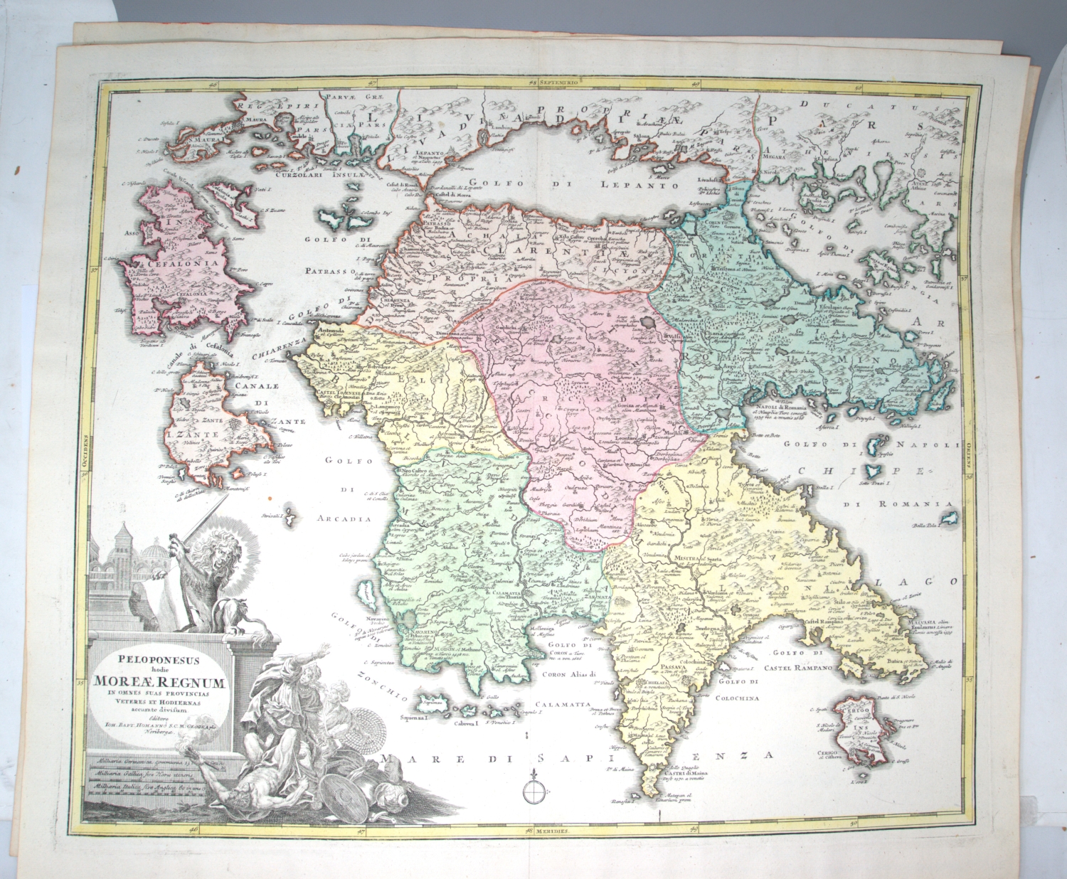 Vorhanden sind: I. Willem Janszoon Blaeu. Calabria Citra olim Magna Graecia. Grenzkoloriert. 1660. - II. Derselbe. Campagna di Roma, olim Latium. Patrimonio di S. Pietro et Sabina. Mit Grenzkolorit. Amsterdam 1640. - III. Derselbe. Calabria ultra olim altera magnae Graeciae pars. Mit Grenzkolorit. Amsterdam 1640. - IV. Derselbe. Terra di Lavoro, olim Campania Felix. Mit Grenzkolorit. Amsterdam, 1644. - V. Georg Braun und Franz Hogenberg. Calaris, Malta, Rhodus, Famaugusta. Köln 1574. - VI. Johann Baptist Homann. Sardiniae Regnum et Insula. Mit Flächenkolorit. Nürnberg 1734. - VII. Derselbe. Peloponesus hodie Moreae regnum. Mit Grenz- und Flächenkolorit. Nürnberg 1730. - VIII. Derselbe. Insula Corsicae accurata Chorographia Tradita. Mit Grenz- und Flächenkolorit. Nürnberg 1735. - IX. Henricus Hondius und Johannes Janssonius. Morea olim Peloponnesus. Koloriert. Amsterdam 1636.