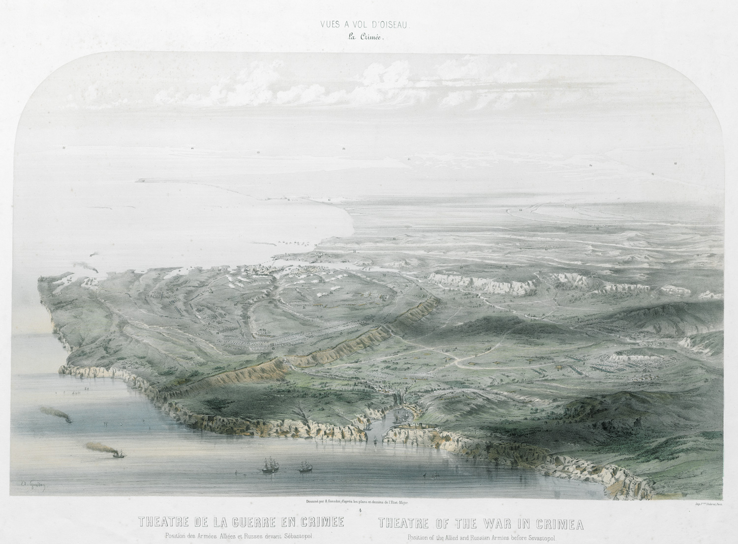 Guesdon, A. Theatre de la guerre en crimee. Position des Armées Alliées et Russes devant Sébastopol. Chromolithographie. 35 x 56 cm (Darstellung). Paris, Francois Delarue, um 1860.
