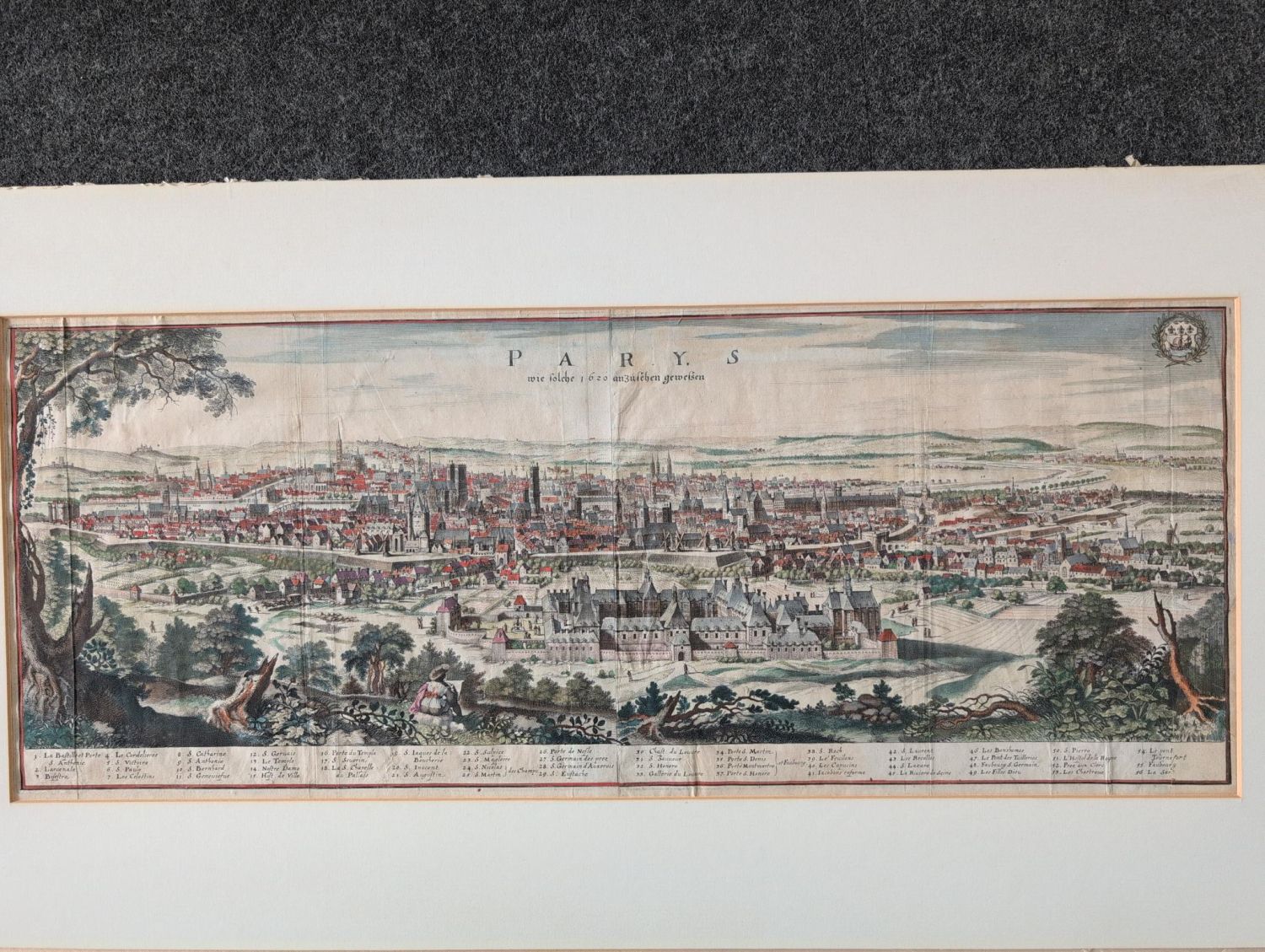 Fauser 10602. – Hübsche Ansicht der Stadt Paris von einer Anhöhe aus von Matthäus Merian (1593-1650). Mit Wappen und Legende. – Mit Mittelfalz, Knapp beschnitten, mit hinterlegten Einrissen. Im schönen Kolorit.
